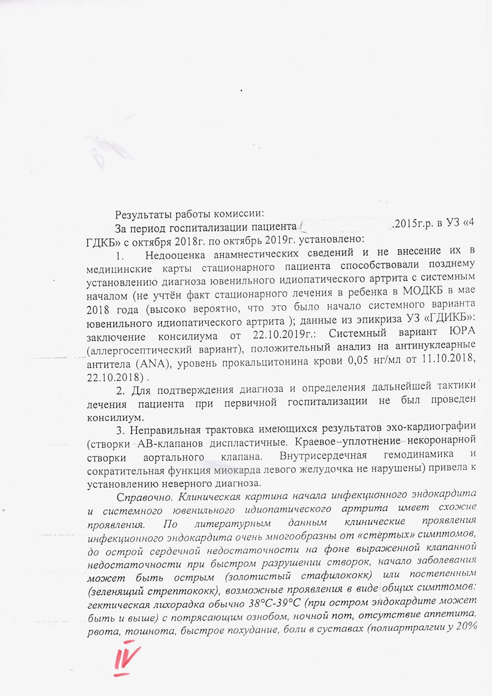— Перевели их с утра, но заведующая отделением смогла произвести осмотр ближе к концу рабочего дня — «в связи с большой загруженностью». Все были уверенны в диагнозе ЮРА, но, проведя осмотр, доцент и завотделением решили не соглашаться с двумя вышеупомянутыми больницами и поставили свой диагноз — острый и подострый инфекционный эндокардит.