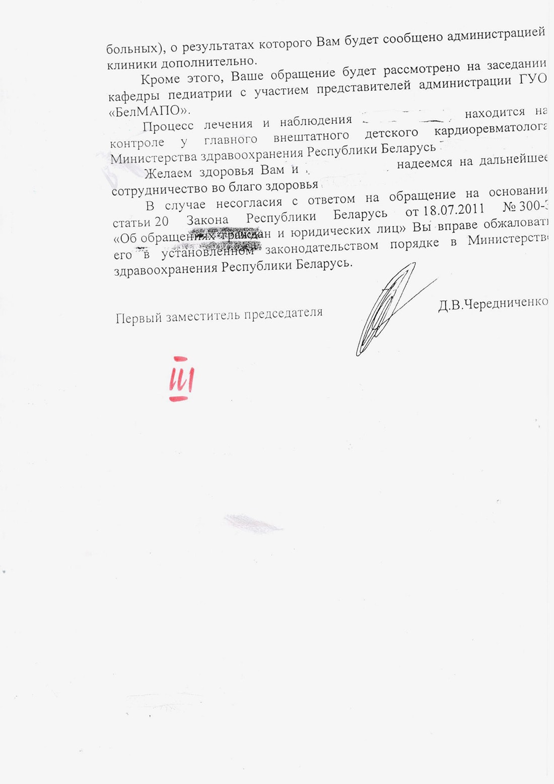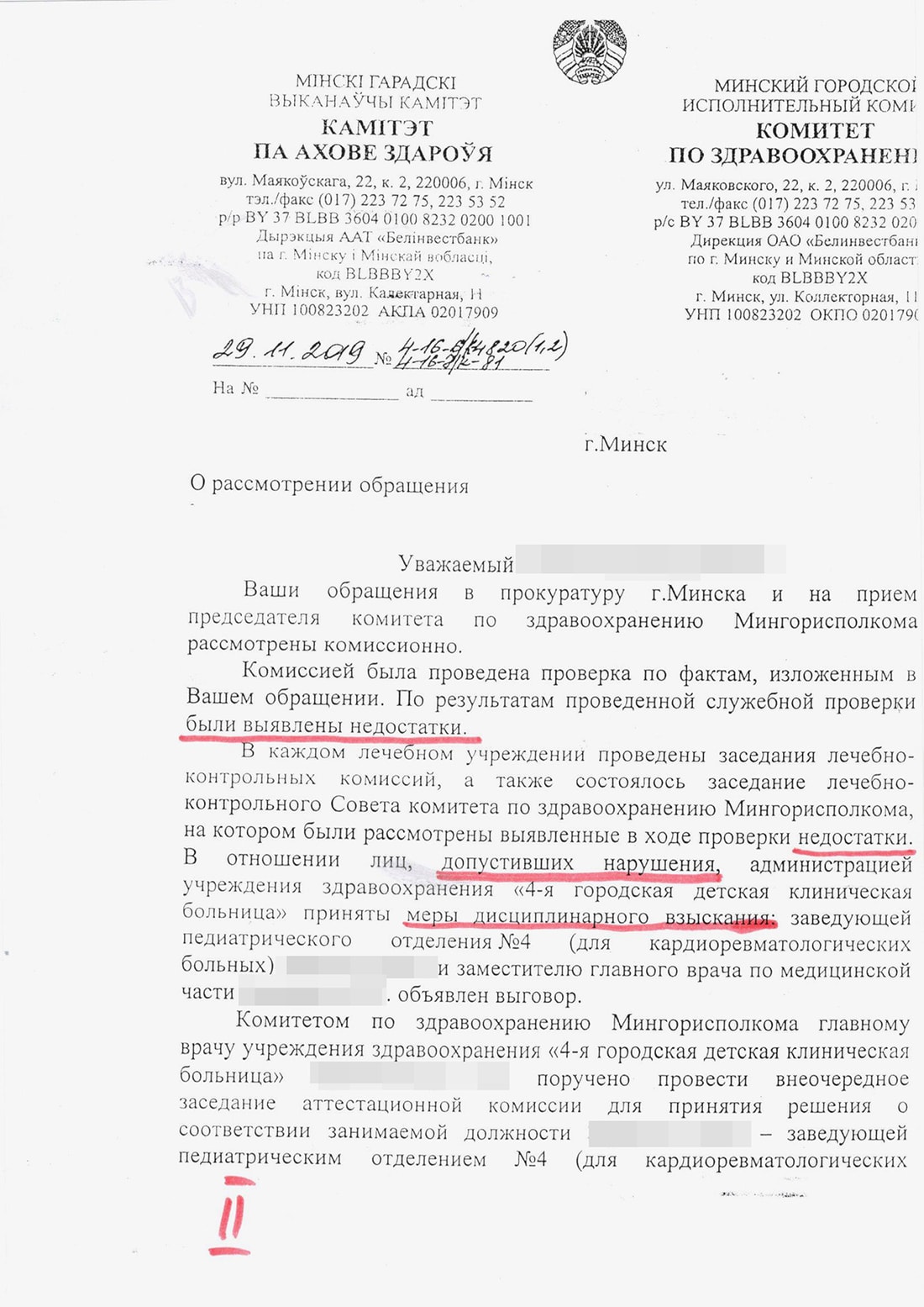 В отношении лиц, допустивших нарушения, администрацией учреждения здравоохранения «4-я городская детская клиническая больница» приняты меры дисциплинарного взыскания: заведующей педиатрического отделения №4 объявлен выговор, как и заместителю главного врача.