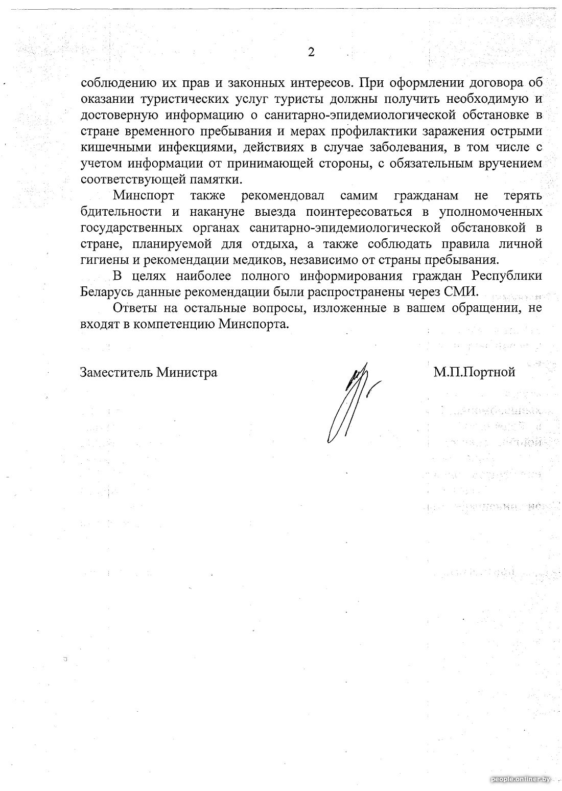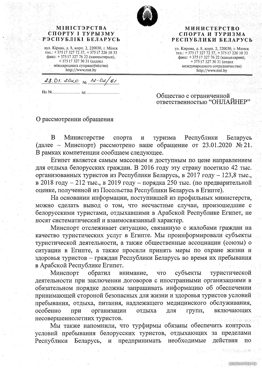 Ответ такой: «На основании информации, поступившей из профильных министерств, можно сделать вывод о том, что несчастные случаи, произошедшие с белорусскими туристами, отдыхавшими в Арабской Республике Египет, не носят систематический и взаимосвязанный характер».