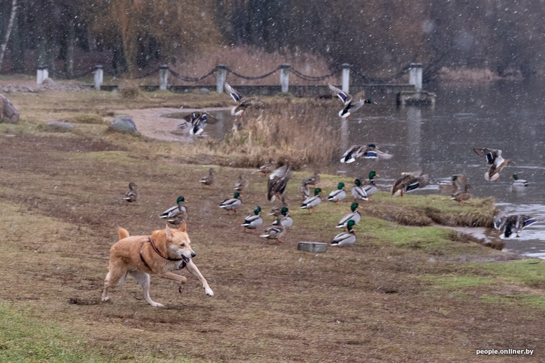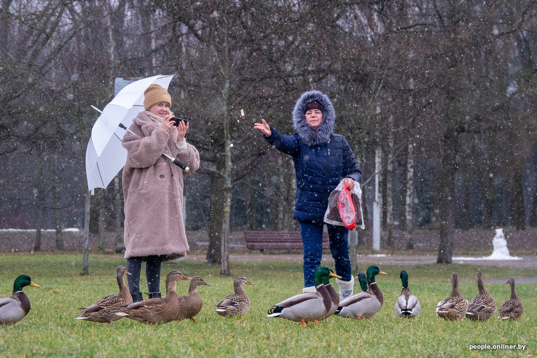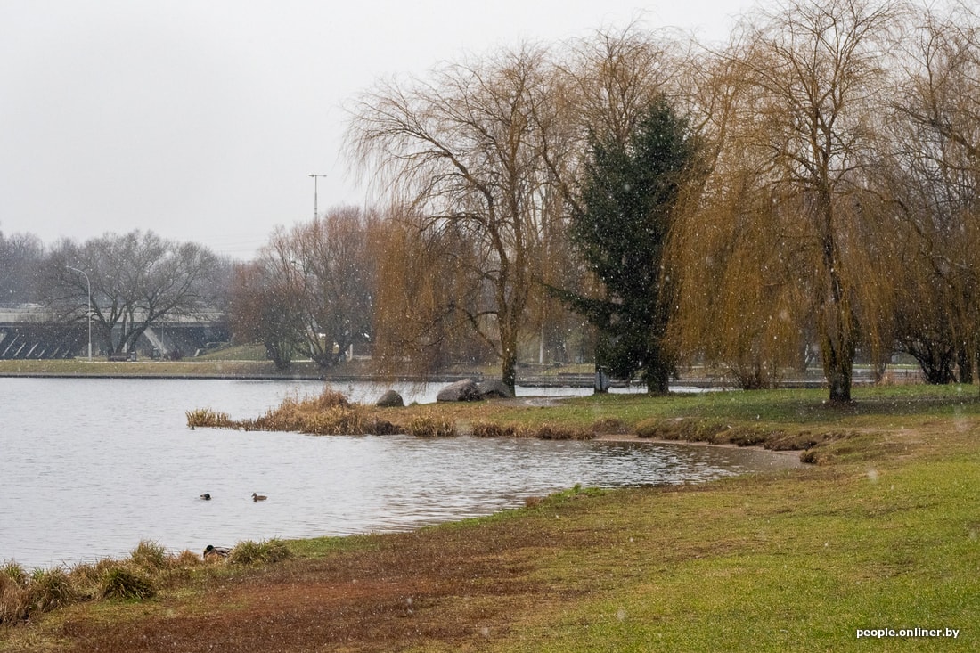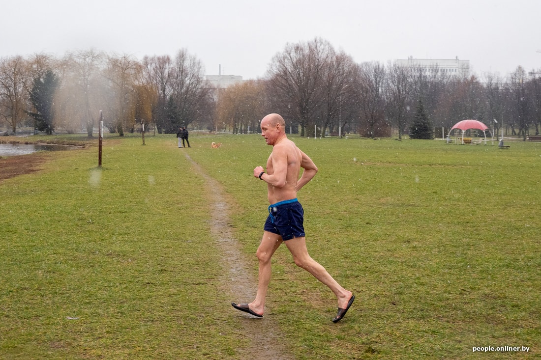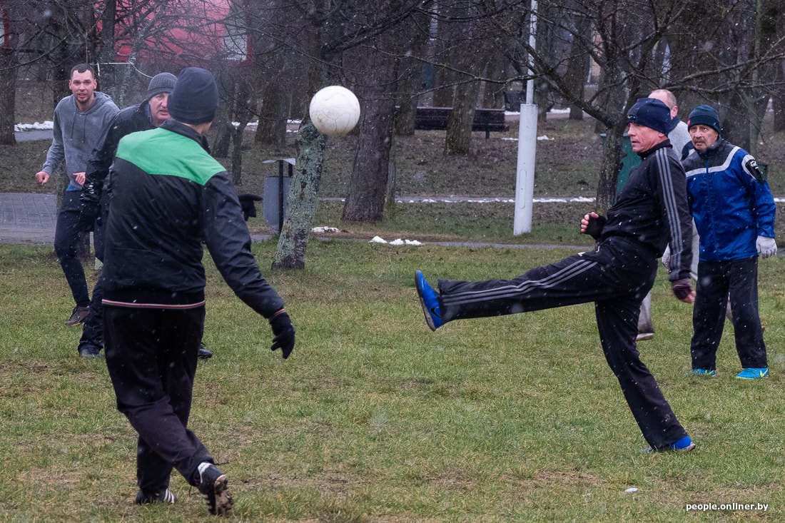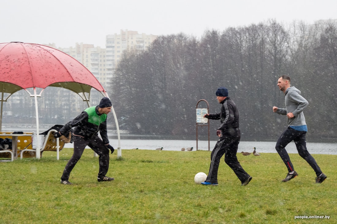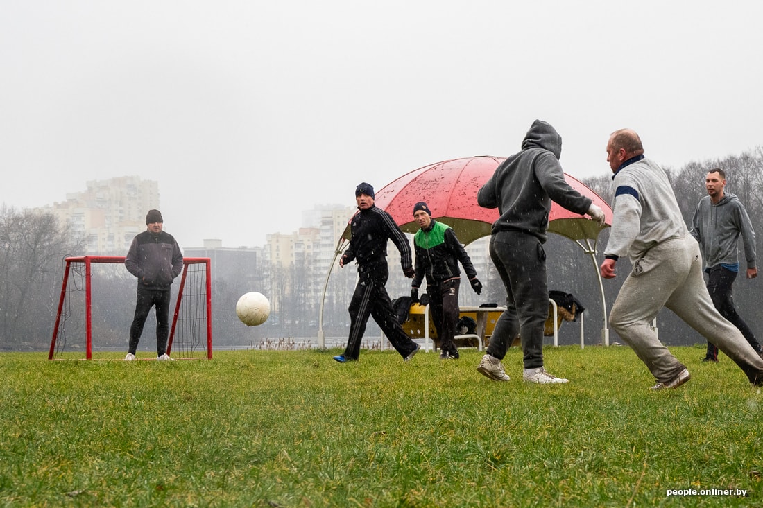 Конец января. Мы застаем Дмитрия в компании в основном немолодых ребят на футбольной площадке в парке. Дождь с мокрым снегом, высокая влажность и скользкая трава — минчан это не смущает. Старшему игроку здесь 75 лет, самому молодому — примерно 30. Кто-то из них отпрашивается с работы, чтобы успеть на традиционный футбол. Белорусы играют так уже несколько лет.