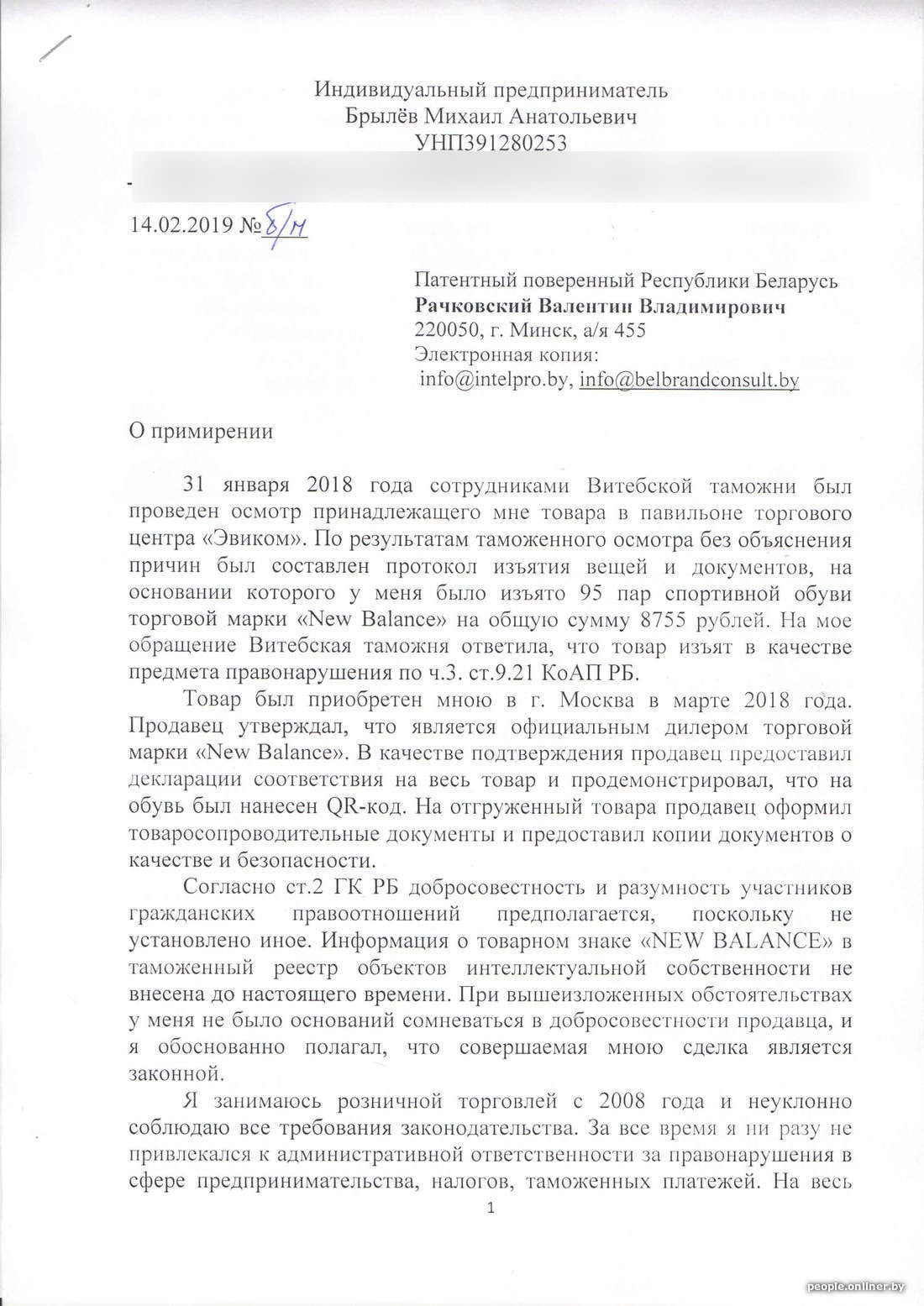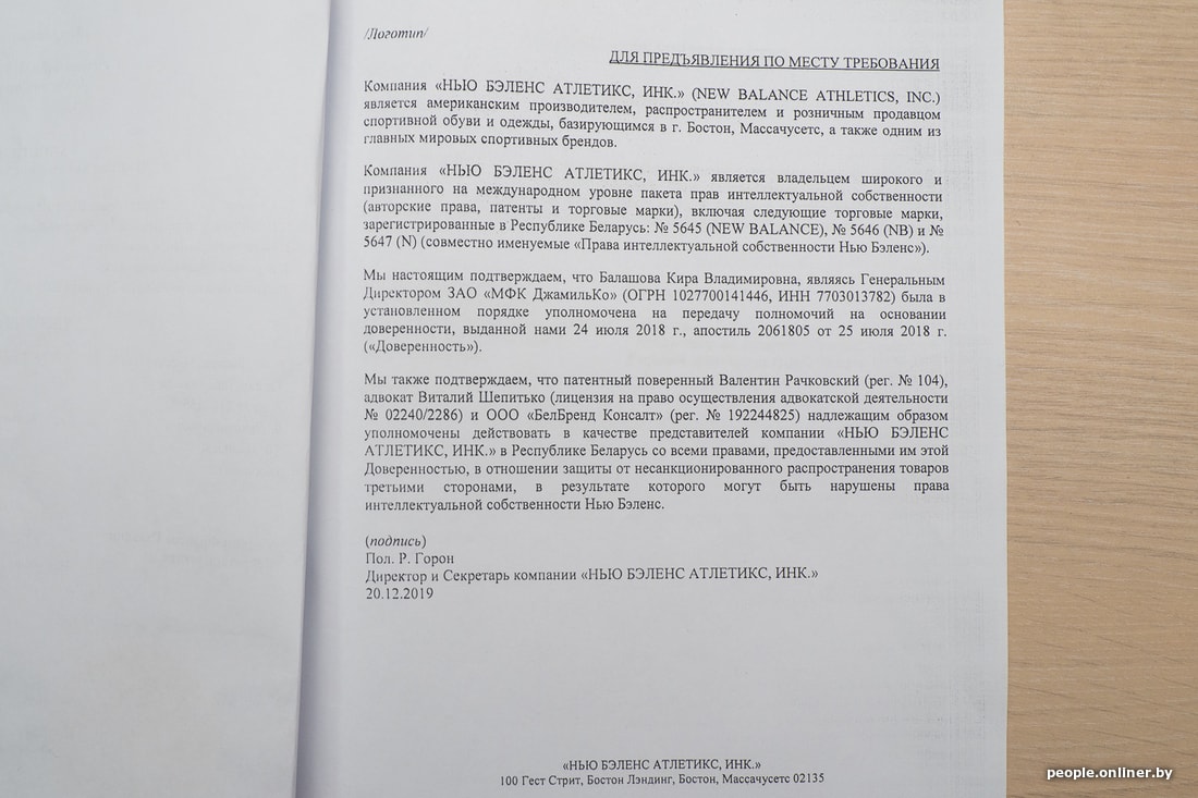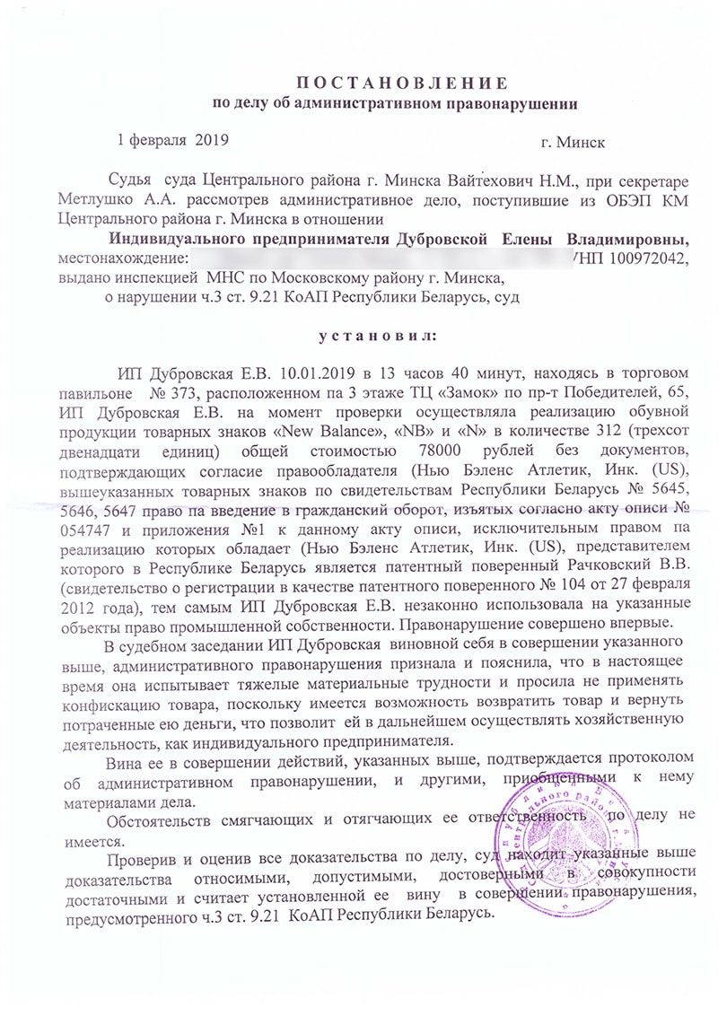 История о защите интеллектуальных прав американского бренда New Balance в Беларуси началась в конце позапрошлого года. Тогда многие индивидуальные предприниматели из Минска и других городов нашей родины познакомились с патентным поверенным Валентином Рачковским. Собственно, этот юрист и ведает защитой, занимаясь всеми административными и гражданскими делами. Речь идет как о параллельном импорте, так и об откровенном фейке. Товар изымали, проводились суды, некоторые бизнесмены просто заканчивали заниматься продажей New Balance. Правда, нашлись и сильно несогласные.