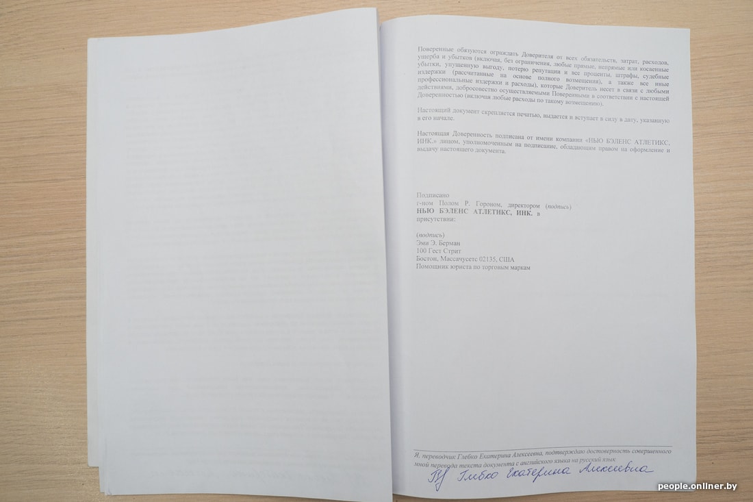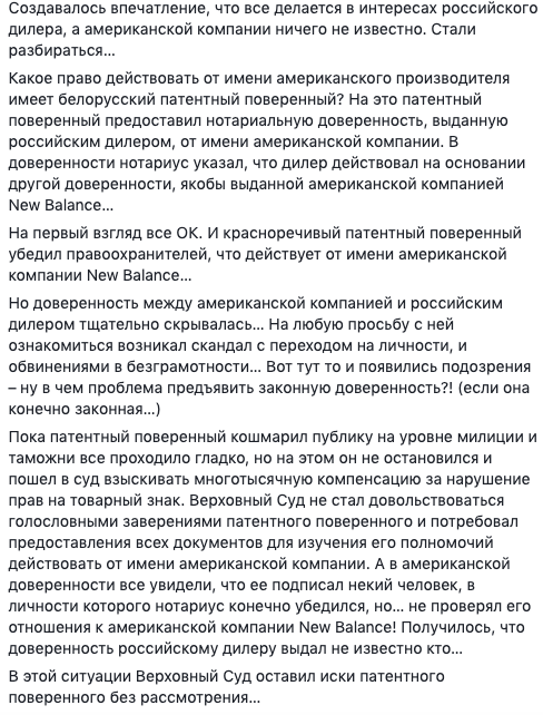 При рассмотрении административных дел американская доверенность так и не появилась. На этом дело не кончилось. Патентный поверенный предъявил не менее двух исков в отношении предпринимателей в Верховный суд, который не стал довольствоваться его голословными заявлениями и настоял на предоставлении всех документов, которые обеспечивали право действовать от имени американской компании. А в американской так называемой «доверенности» все увидели, что ее подписал некий человек, в личности которого нотариус убедился по водительским правам, но не проверял его отношения к американской компании New Balance!