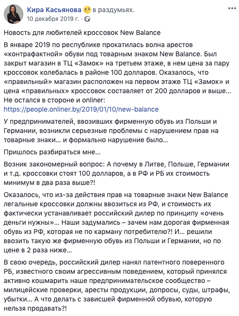 — Моя доверительница Елена продавала лицензионные кроссовки New Balance, завезенные в страну по всем правилам. Правда, не из России, а из Польши. Ранее она продавала товар от российского дилера, но потом поняла, что минимальные отпускные цены, которые устанавливают россияне, слишком высоки и делают товар фактически недоступным для белорусов с учетом уровня зарплат. Пара кроссовок стоила почти половину средней зарплаты.