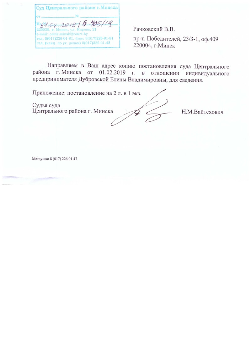 — В начале прошлого года Рачковский написал на меня заявление о нарушении исключительного права на товарные знаки. Витебская таможня начала производство об административном правонарушении по части 3 статьи 9.21 КоАП Беларуси. Но в октябре суд Октябрьского района Витебска прекратил дело за отсутствием состава правонарушения. Областной суд поддержал выводы суда первой инстанции.
