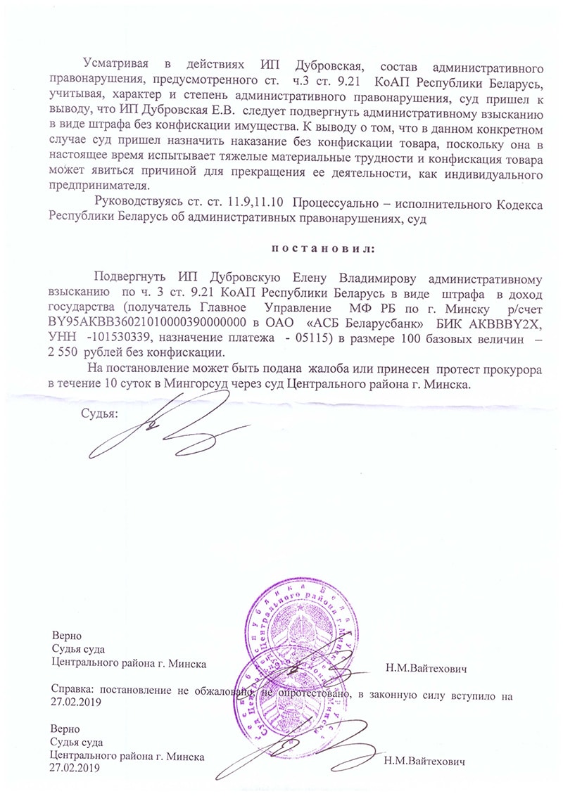Патентный поверенный отметил, что Дубровская — единственная из параллельных импортеров, которая предпочла внесудебному урегулированию путь прямого конфликта с правообладателем. По результатам рассмотрения административного дела предпринимательница была подвергнута максимальному по части 3 статьи 9.21 КоАП штрафу — 100 базовых величин (шкала для предпринимателей — от 50 до 100 базовых величин). Из всех дел за 2019 год это наибольший штраф для ИП.