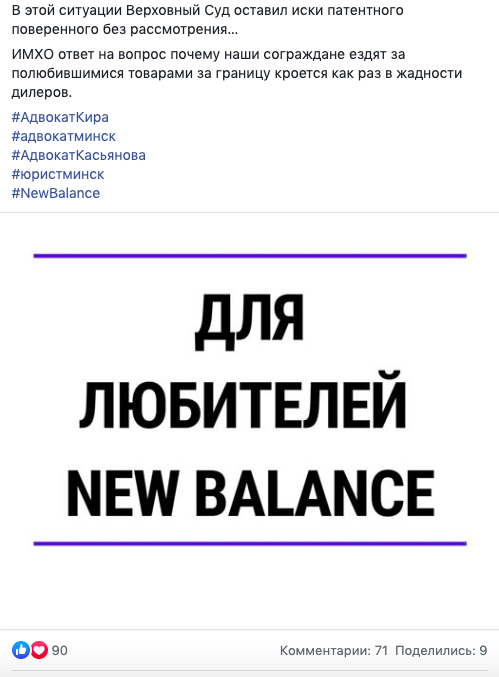 Что касается опубликованного адвокатом Касьяновой поста на ее странице в Facebook, Рачковский называет написанное недостоверным. Дескать, после его прочтения может создаться впечатление, что адвокат защищала интересы множества предпринимателей, допустивших нарушения в отношении товарного знака NB. Хотя к ней обратился только один предприниматель — ИП Дубровская, которая после получения претензии допустила повторный ввоз товара без разрешения правообладателя, что и явилось основанием для привлечения ее к административной ответственности.