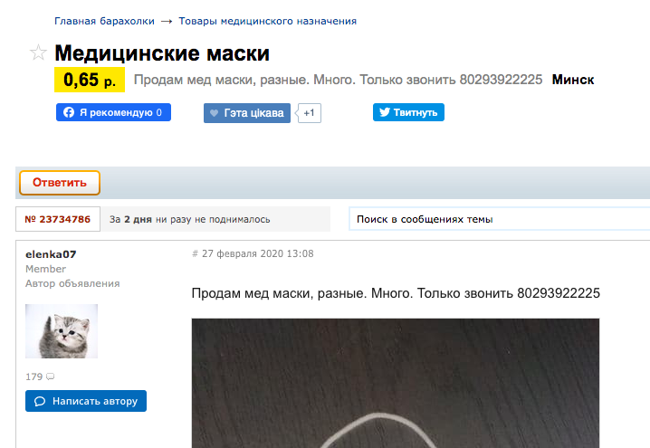 — Маска медицинская. В наличии 800 штук, отправлю в любой город, — гласит одно из объявлений, которое автор поднял сегодня.