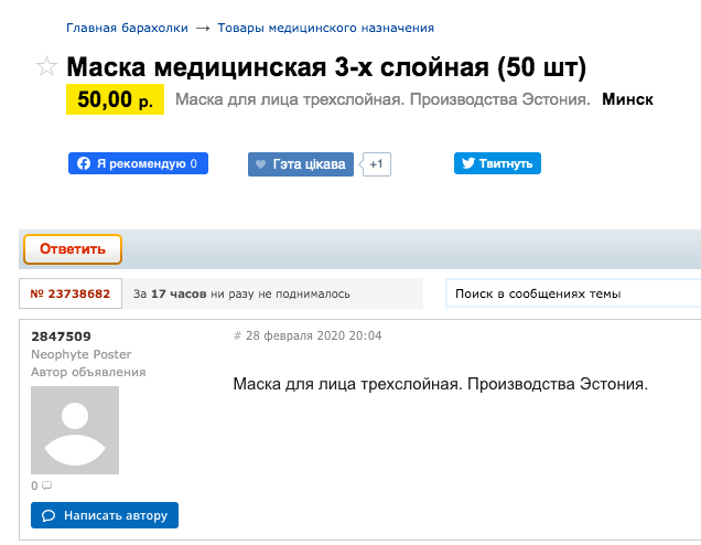 Вот и выходит, что за 50 масок автор этого объявления выручил 1100 рублей, почти средняя зарплата по Белстату.