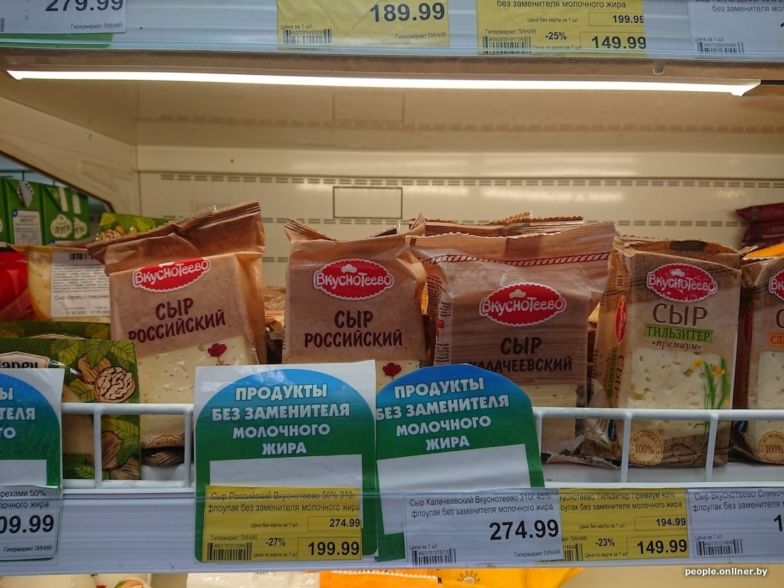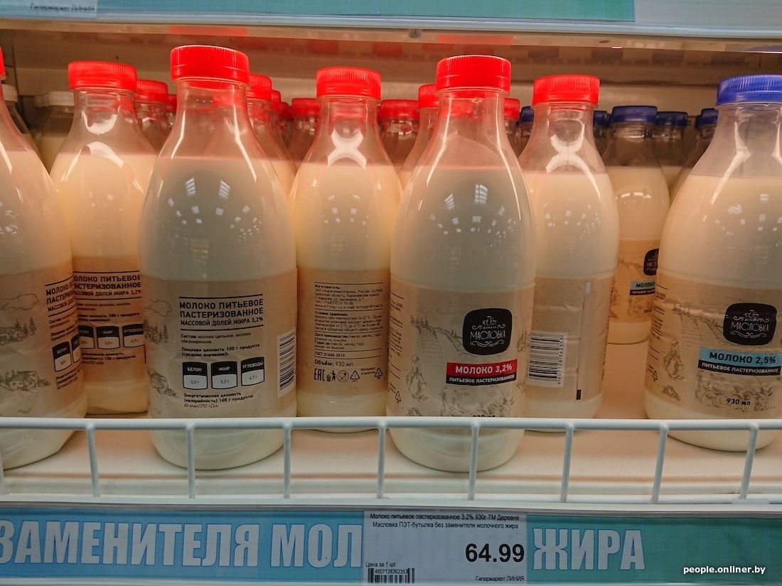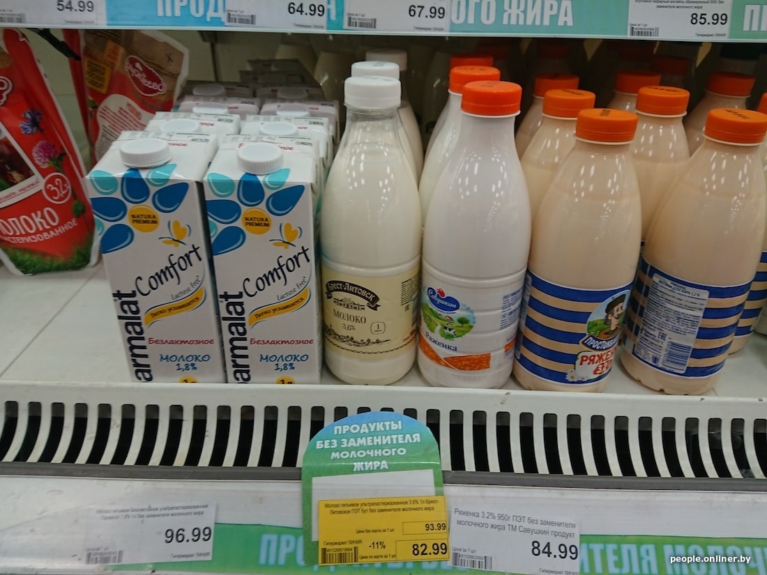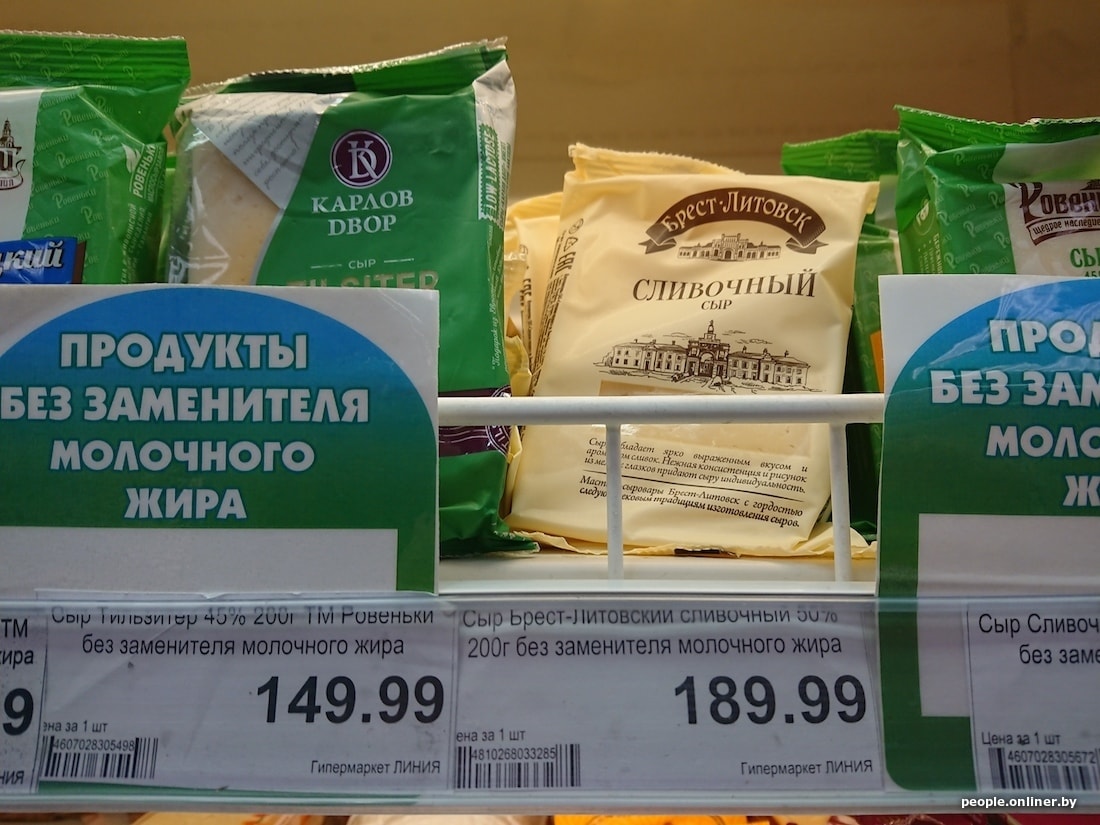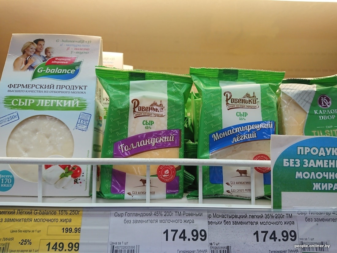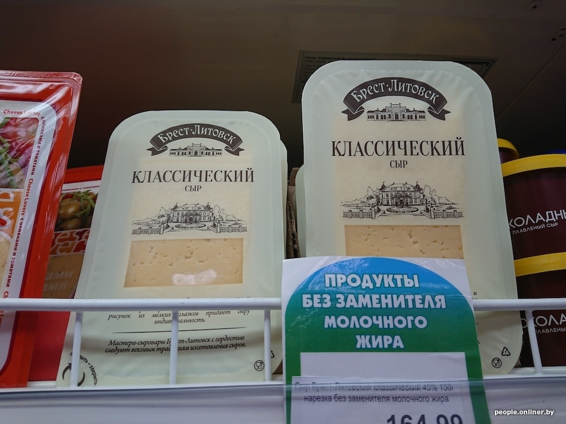 Белорусская бутылка молока с 3,2%-ной жирностью дешевле российской на 40 копеек, кефир 2,5% вообще отличается на 1,5 рубля. Сыр в Смоленске тоже сильно дороже: 200-граммовый брусок «Голландского» в российском гипермаркете стоит 5,54 белорусского рубля, в нашем — 3,15. Сливочный сыр марки «Брест-Литовск» тоже заметно отличается по цене — почти вдвое: у нас брусок стоит 3,59 рубля, в Смоленске — 6,01.