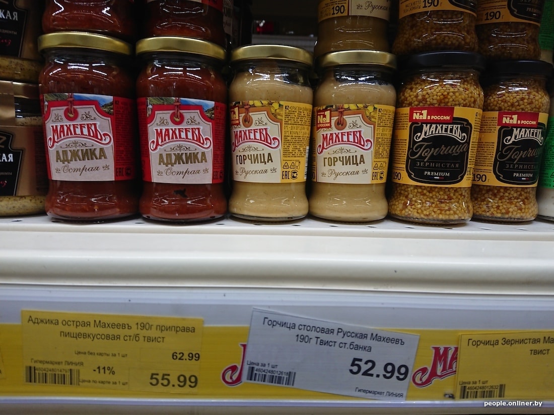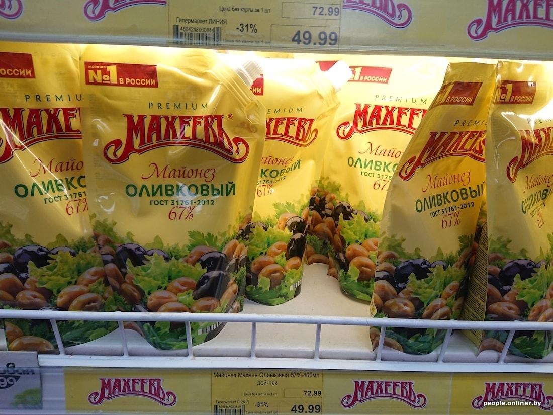 Со сметаной попроще. 315-граммовая банка 20%-ной жирности от «Простоквашино» в Смоленске стоит 2,94 рубля — это на 49 копеек дороже, чем в Минске. Интересно, что некоторые продукты российского производства в родной стране дороже, чем у нас. Например, 400 мл оливкового майонеза «Махеевъ» в смоленской «Линии» оценили в 2,31 рубля, в минском «Евроопте» — в 2,19.