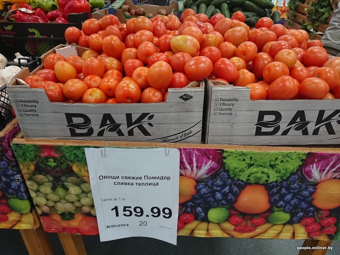 Спойлер: в овощном отделе такой душераздирающей разницы в ценах, как в молочном, не предвидится. Но все равно разрыв чувствительный: особенно в стоимости бананов и томатов. В наших магазинах стартовая цена за килограмм желтого фрукта — 2,99, нередко ценники скачут чуть ли не до 3,5 рубля. Белорус, проходящий мимо бананов в смоленском «гипере», невольно задумается: «А что, если их стали выращивать в России?» Здесь цена за кило — 2,22. Помидорки тоже солидно разбегаются в цене: килограмм «сливок» у нас стоит 5,75 рубля, а здесь — 5,06.