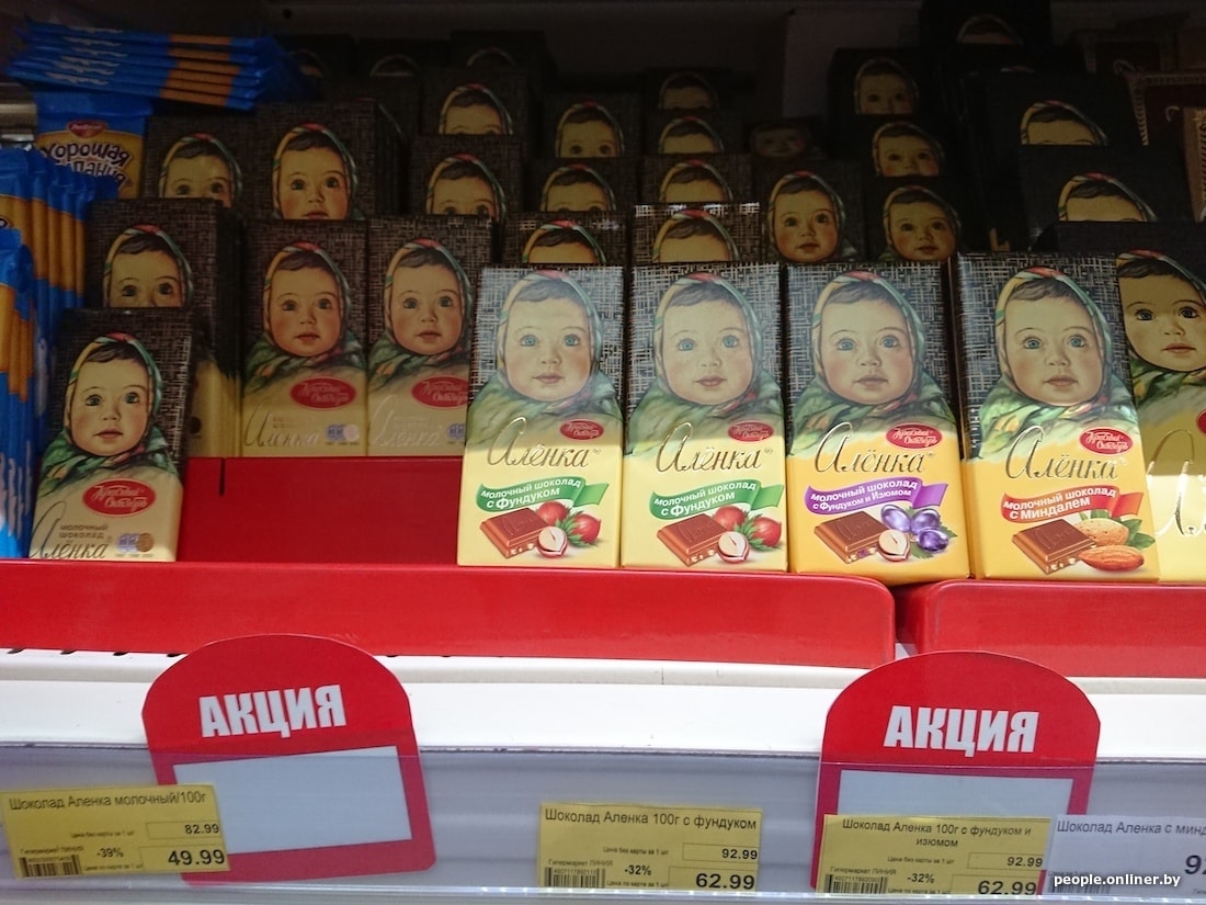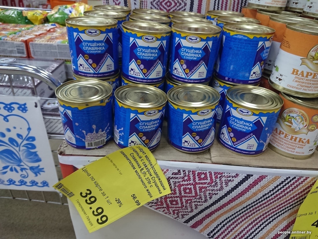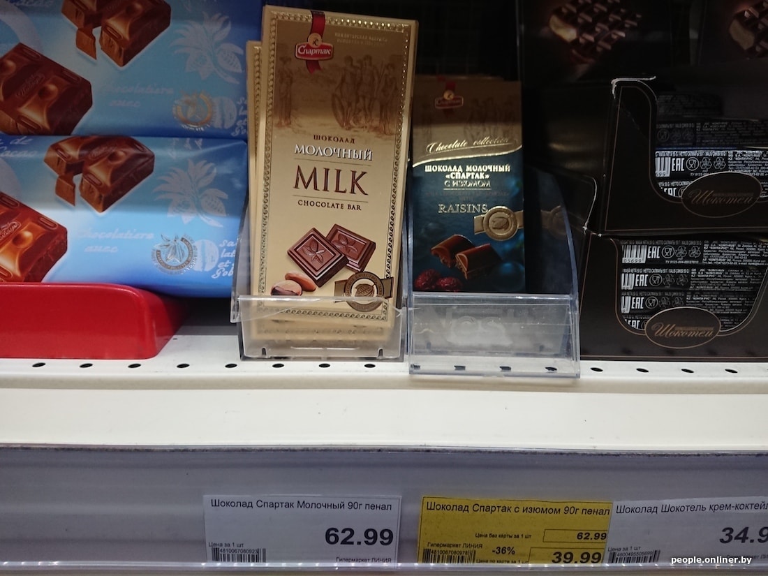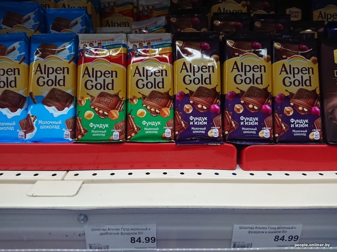 Купить к чаю молочную шоколадку от нашего «Спартака» в Смоленске выгоднее на 20 копеек. Зато импортная Alpen Gold сэкономит у белорусов почти рубль: у нас шоколадка стоит 1,89, в России — 2,69. 370-граммовая банка сгущенки неожиданно дешевле у нас — аж на 35 копеек, правда, российского производства.