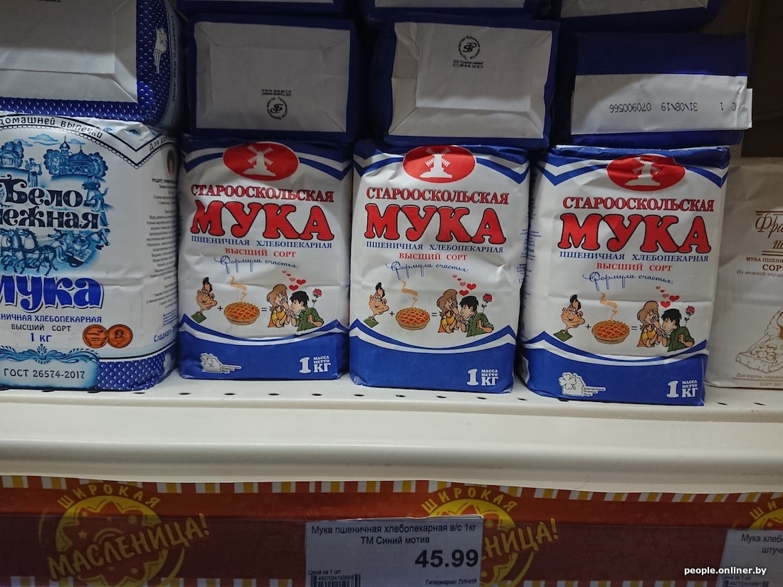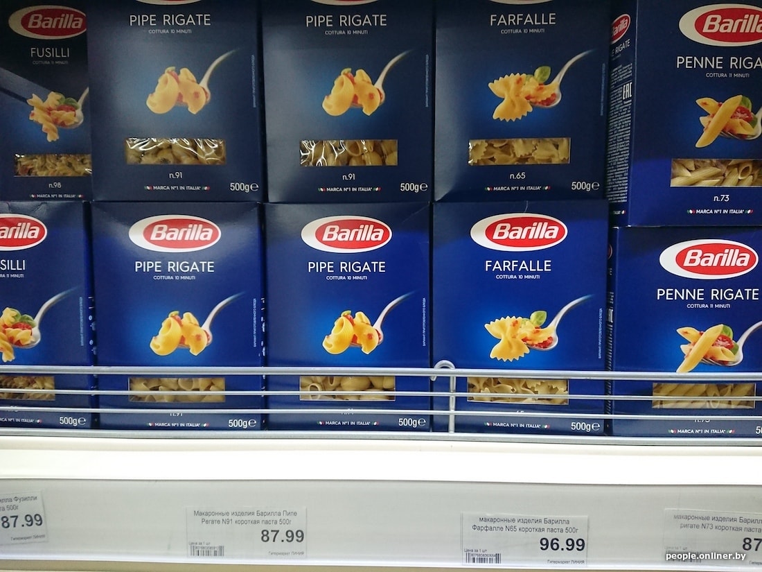 800-граммовый пакет гречки в Смоленске стоит на 65 копеек дешевле, чем у нас, — 1,11 рубля. Такой же объем шлифованного риса отличается на 68 копеек: в смоленском гипермаркете крупа стоит 1,27 рубля, в минском — 1,95. Килограмм муки высшего сорта у нас дешевле: стоит 1,19 рубля против смоленского за 1,46. Полкилограмма макарон «Барилла» продается в двух странах с разницей в 10 копеек в пользу Беларуси: 2,69 рубля против 2,79.