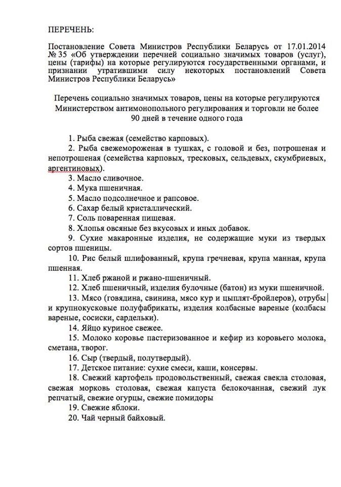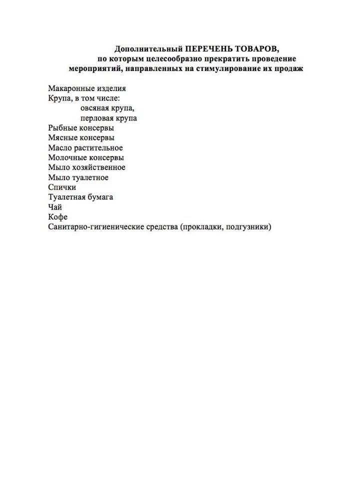 С социально значимыми товарами понятно — для них есть специальное постановление Совмина от 17.01.2014 №35. Но кроме них, антимонопольное ведомство приводит дополнительный список товаров, стимулировать продажи которых не рекомендуется.