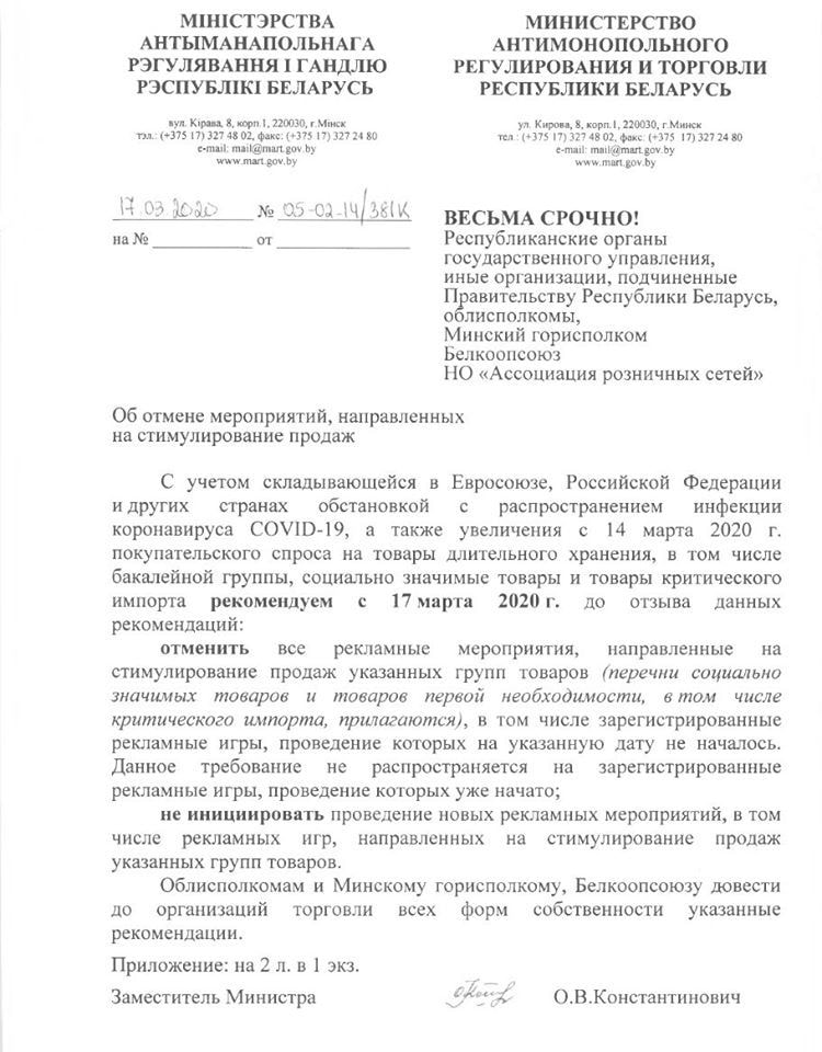 В письме МАРТ рекомендует не рекламировать социально значимые товары и товары первой необходимости «с учетом складывающейся в Евросоюзе, Российской Федерации и других странах обстановкой с распространением инфекции коронавируса COVID-19, а также увеличения с 14 марта 2020 г. покупательского спроса на товары длительного хранения, в том числе бакалейной группы, социально значимые товары и товары критического импорта».