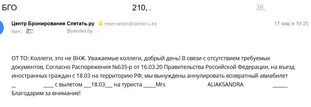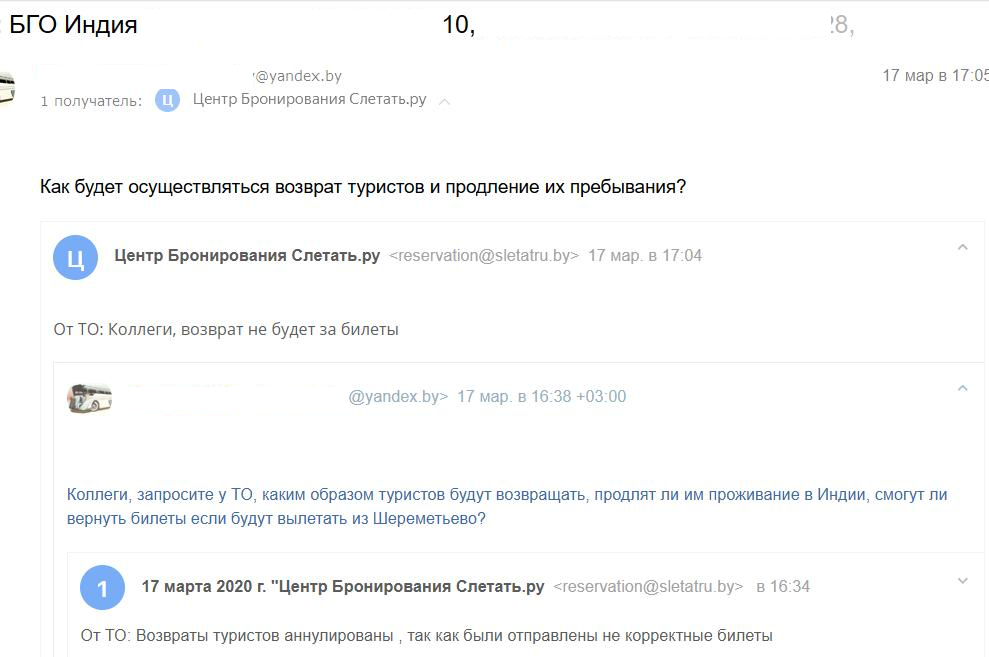 — 18—19 марта нам без объяснения причин аннулировали билеты Гоа — Москва. Вернуться домой самостоятельно невозможно. С каждым днем ситуация на Гоа ухудшается. Мы, граждане Республики Беларусь, просим нас эвакуировать в родную страну, — заявляют туристы.