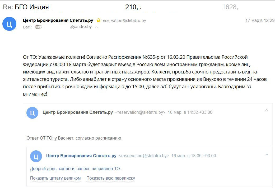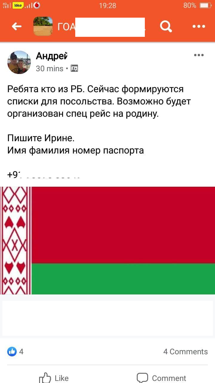 — Уважаемые граждане Республики Беларусь, находящиеся в Индии, Непале, Шри-Ланке и Бангладеш! После вступления в силу Распоряжения Правительства Российской Федерации №635-р от 16 марта 2020 г. граждане Республики Беларусь оказались отрезаны от ранее доступных маршрутов возвращения домой. В частности, не смогла вернуться в Беларусь одна группа из г. Даболим, штат Гоа Республики Индия. На очереди — еще несколько групп из Гоа и Шри-Ланки, нам также известно о проблемных случаях в Непале и штате Керала в Индии. Все необходимые каналы задействованы, но решения по-прежнему нет, — сообщило белорусское посольство в Индии в своем Facebook.