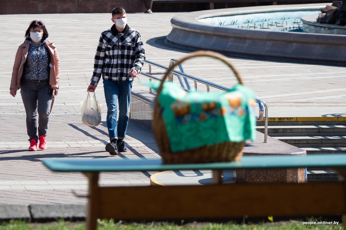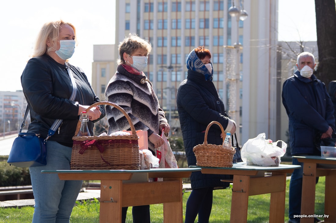 Спустя полчаса народу у Красного костела не становится больше. Люди приходят по одному и становятся к столам. Людмила, которая сегодня пришла освящать куличи, сказала, что настроение из-за вируса плохое.