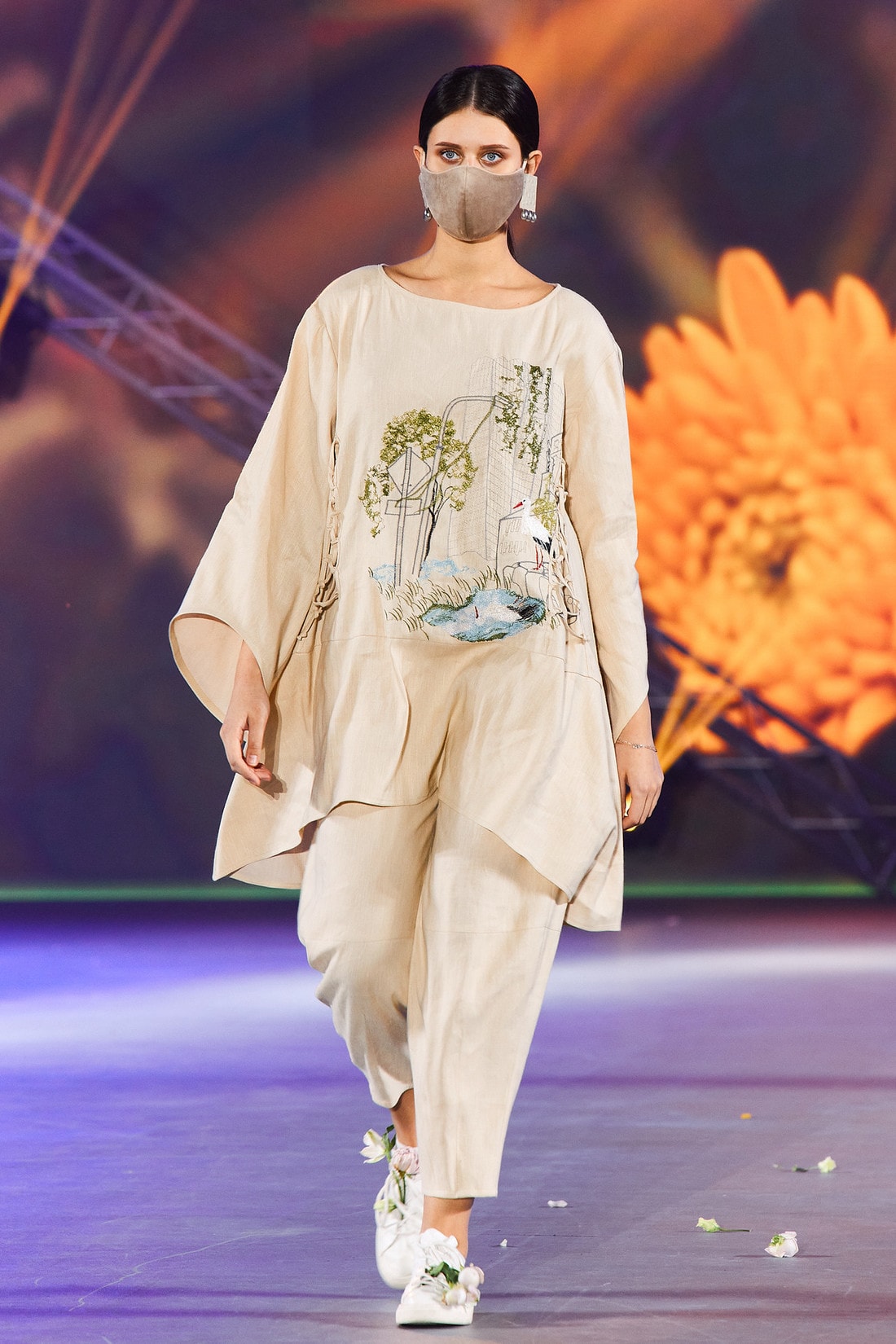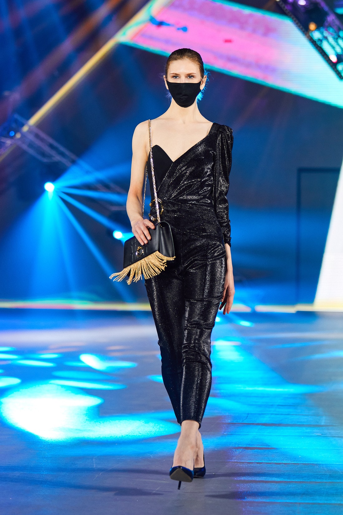 Нет сомнения, что маска может выполнять не только защитную функцию, но и интересно вписаться в образ. Дизайнер бренда Kardash обнаружила, что маска гармонично сочетается с одеждой в тон и с крупными серьгами, завораживающе смотрится украшенная стеклярусом и слезами из страз.