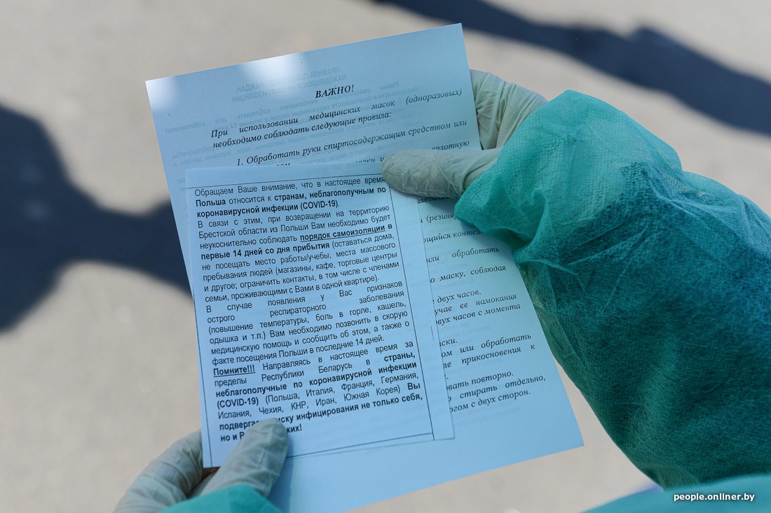 — Если честно, страшно было ехать в Беларусь, — говорит он и отдает заполненную анкету сотрудникам санитарного контроля. — Почему не остался? Потому что нужно было ехать. Но я бы лучше в Польше остался, так как там больше мер принимают в связи с коронавирусом. В магазинах есть антисептики, перчатки, везде два метра расстояние и так далее. А что в Беларуси? Страшно в Беларуси.