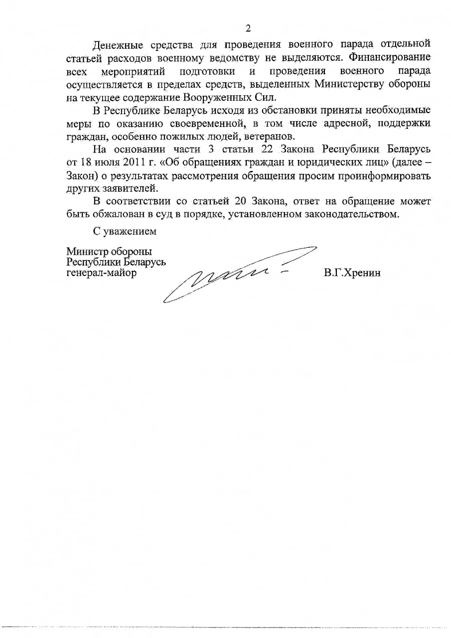 В конце марта белорусы написали петицию в адрес Минобороны и Минздрава. И требовали отменить парад военной техники в Минске. На прошлой неделе получили ответ от министра обороны Виктора Хренина. По мнению чиновника, нынешняя эпидобстановка позволяет провести массовое мероприятие.