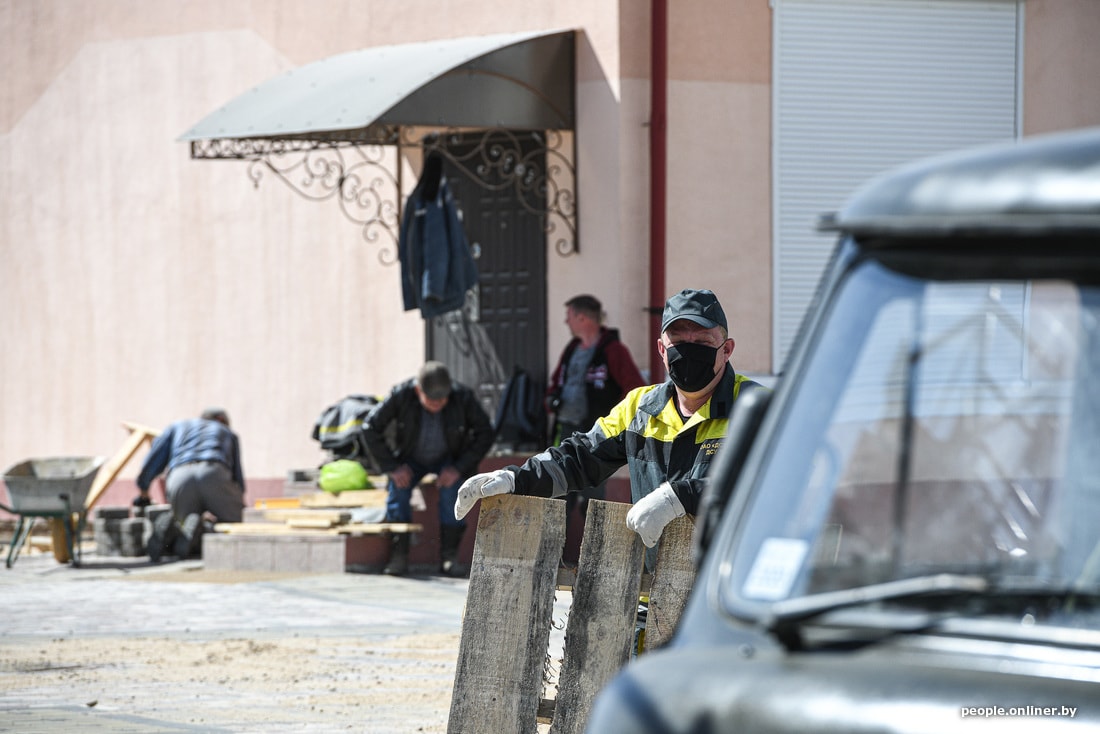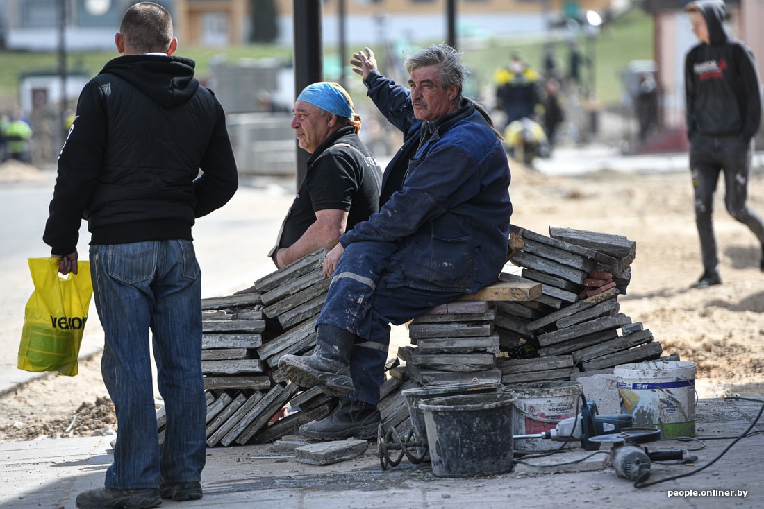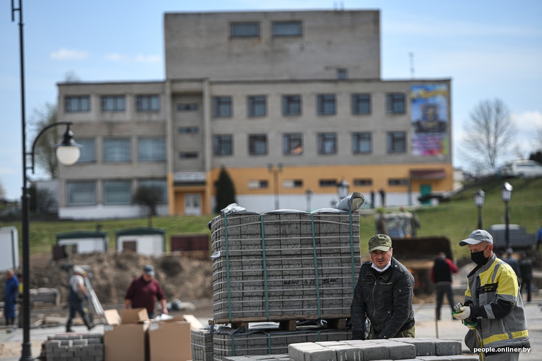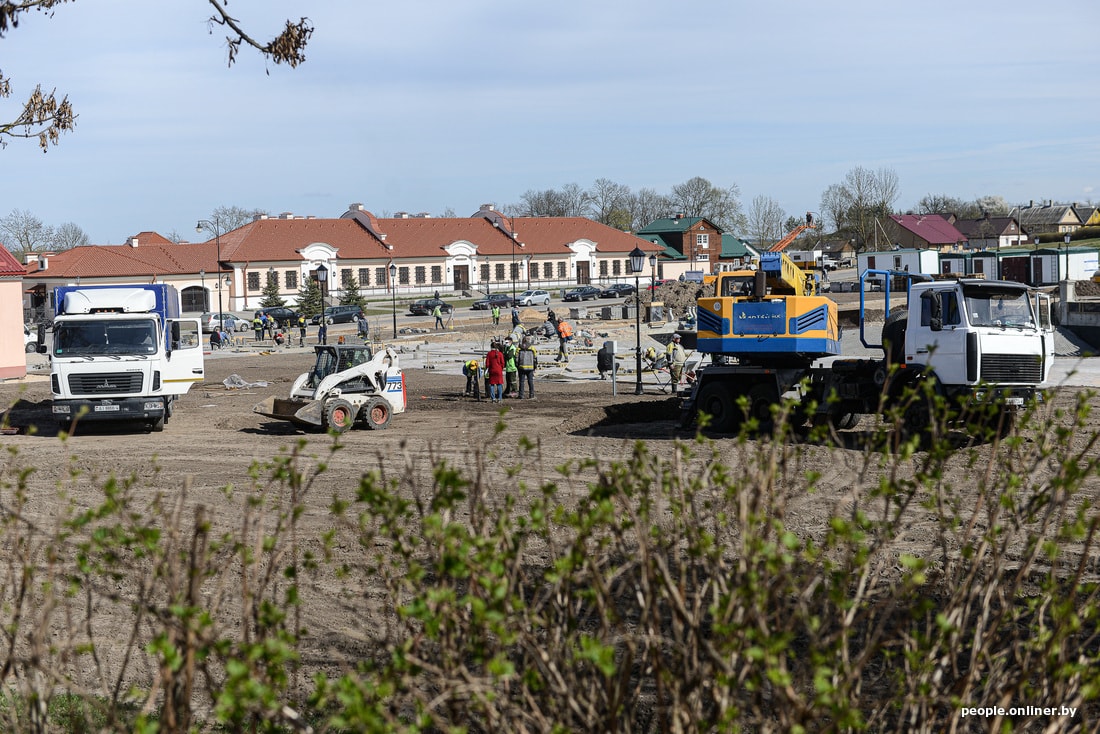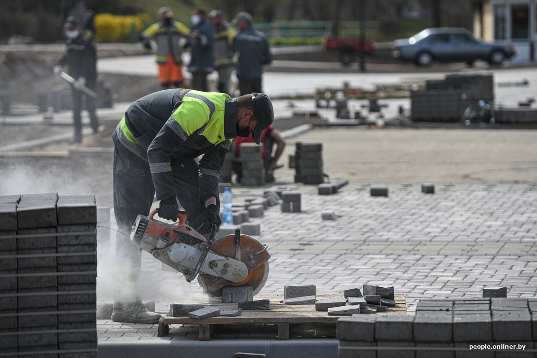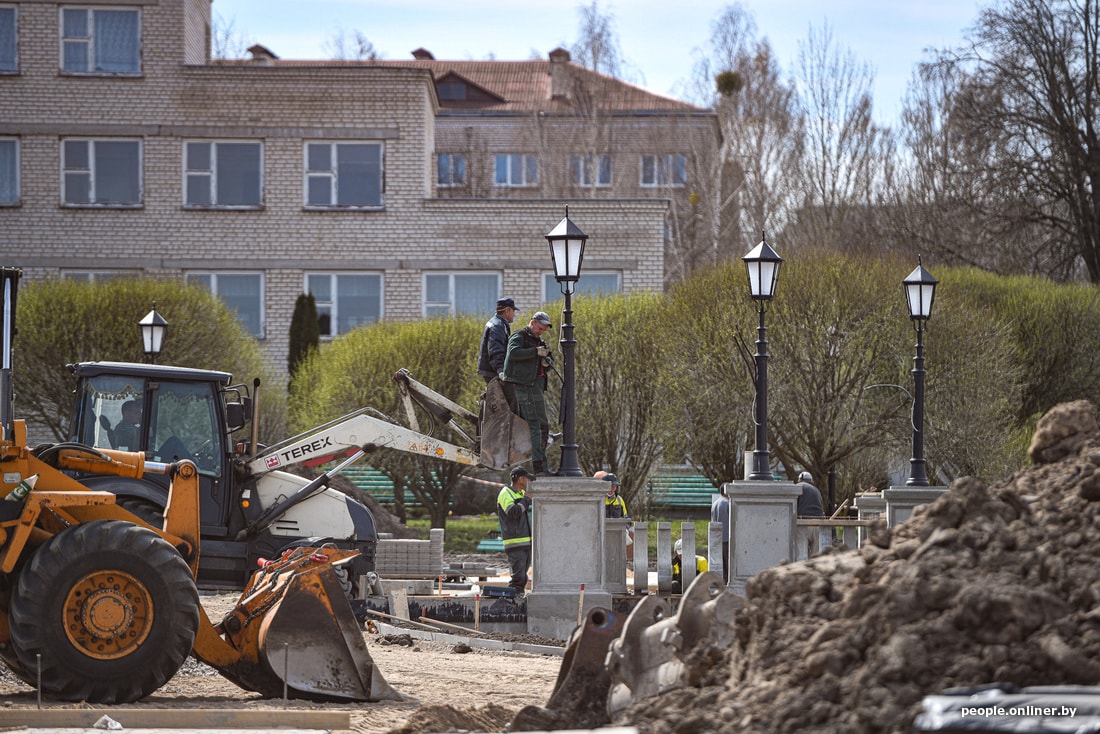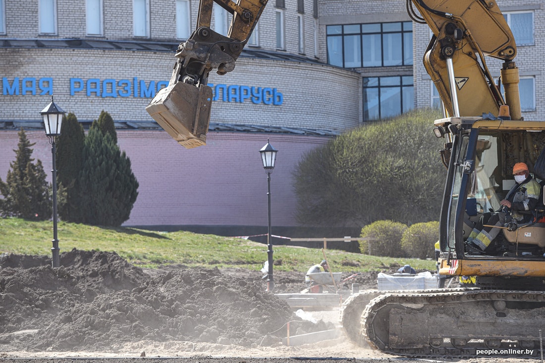 Рабочие стараются как могут — площадь строится, почти как китайская инфекционка, но по белорусским меркам. Строители кричат, бегают туда-сюда, точно что-то делают. Субъективно, над возведением площади трудится человек сто.