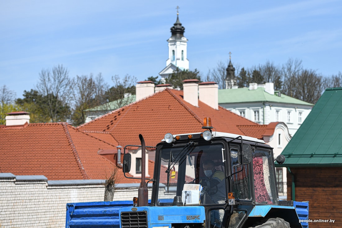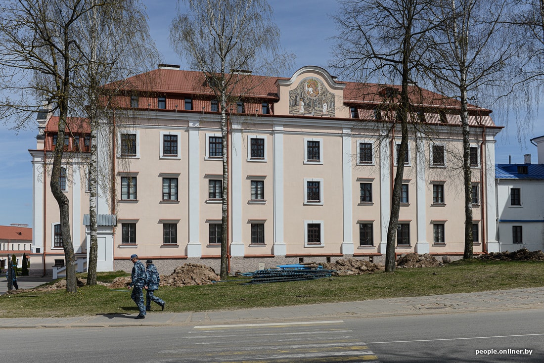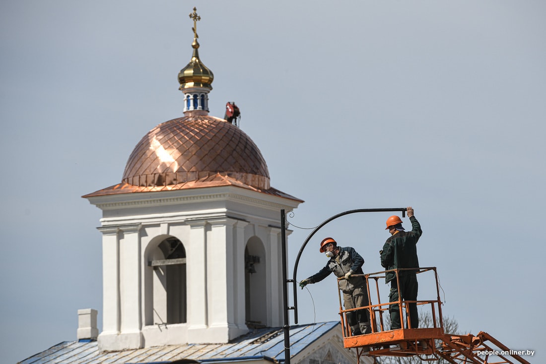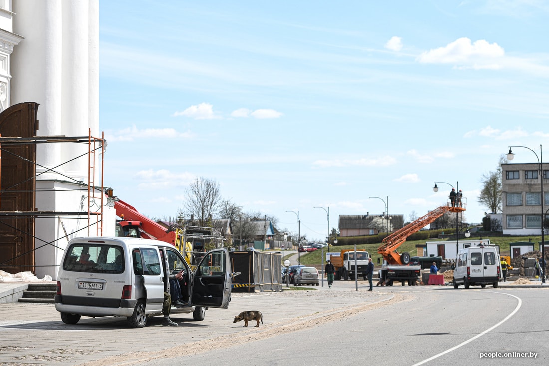 В агрогородке сейчас вовсю идет стройка новой площади аккурат напротив монастыря. Шум, пыль, многолюдно. Ремонтные работы ведутся и на самой территории святыни: люди красят забор, приводят внешности и внутренности храмов в порядок. Все церковные магазины закрыты, местная библиотека тоже. Детсад, школа и аграрно-технический колледж работают как обычно.