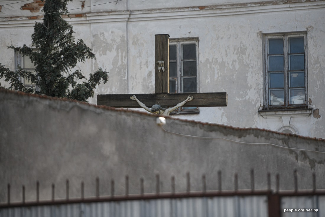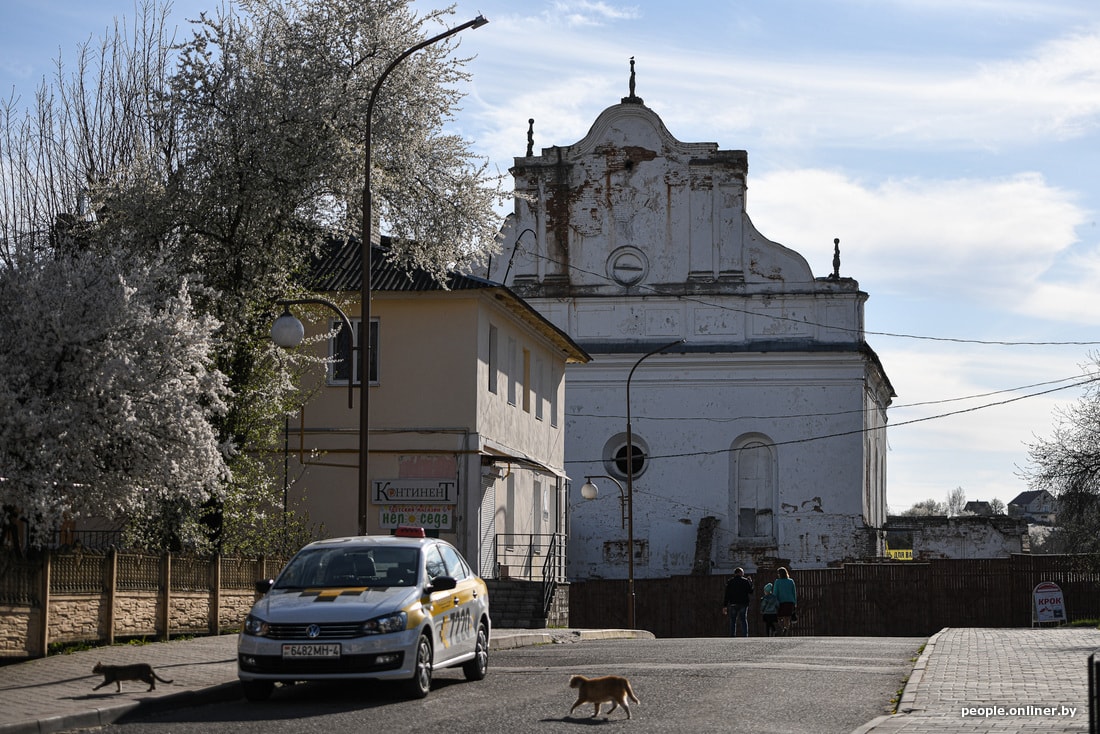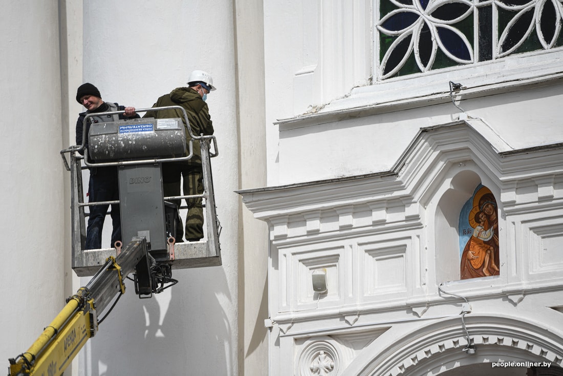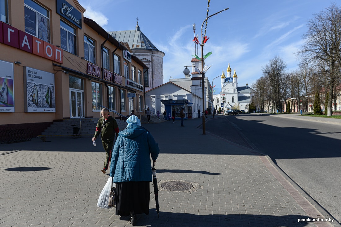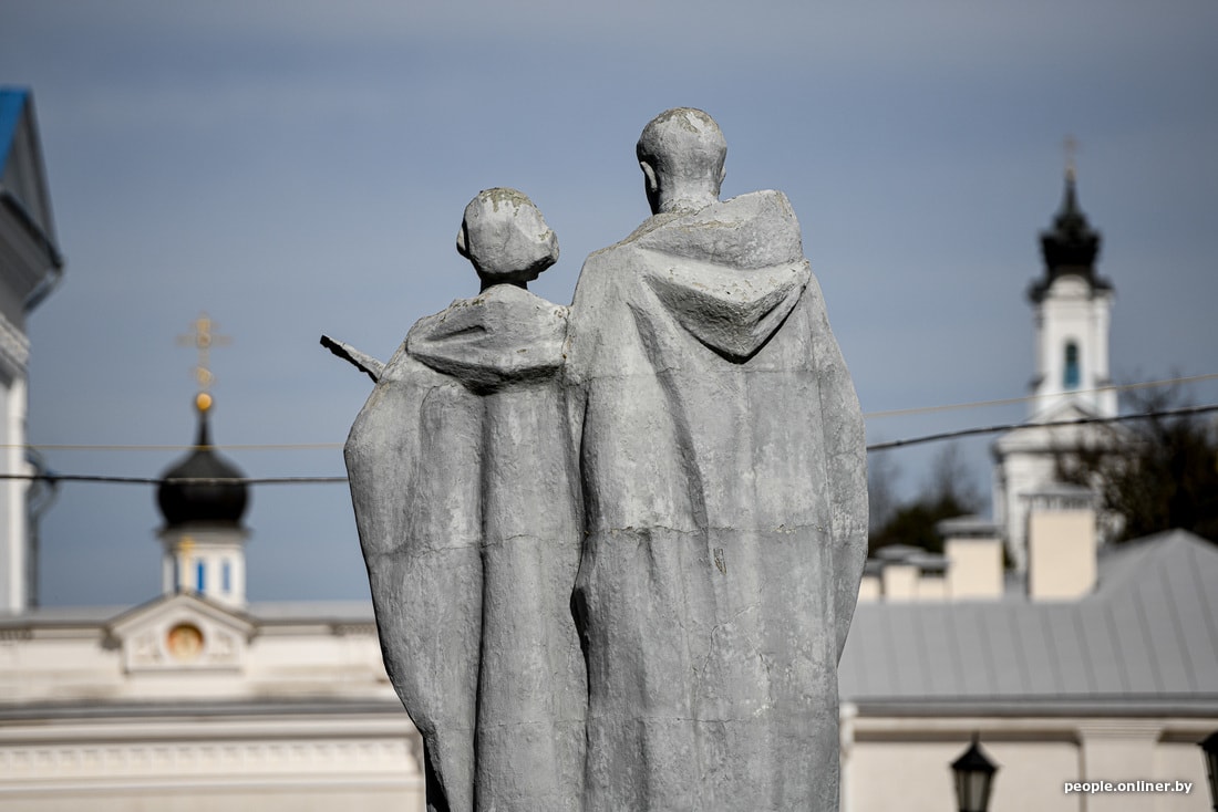 В агрогородке сейчас вовсю идет стройка новой площади аккурат напротив монастыря. Шум, пыль, многолюдно. Ремонтные работы ведутся и на самой территории святыни: люди красят забор, приводят внешности и внутренности храмов в порядок. Все церковные магазины закрыты, местная библиотека тоже. Детсад, школа и аграрно-технический колледж работают как обычно.