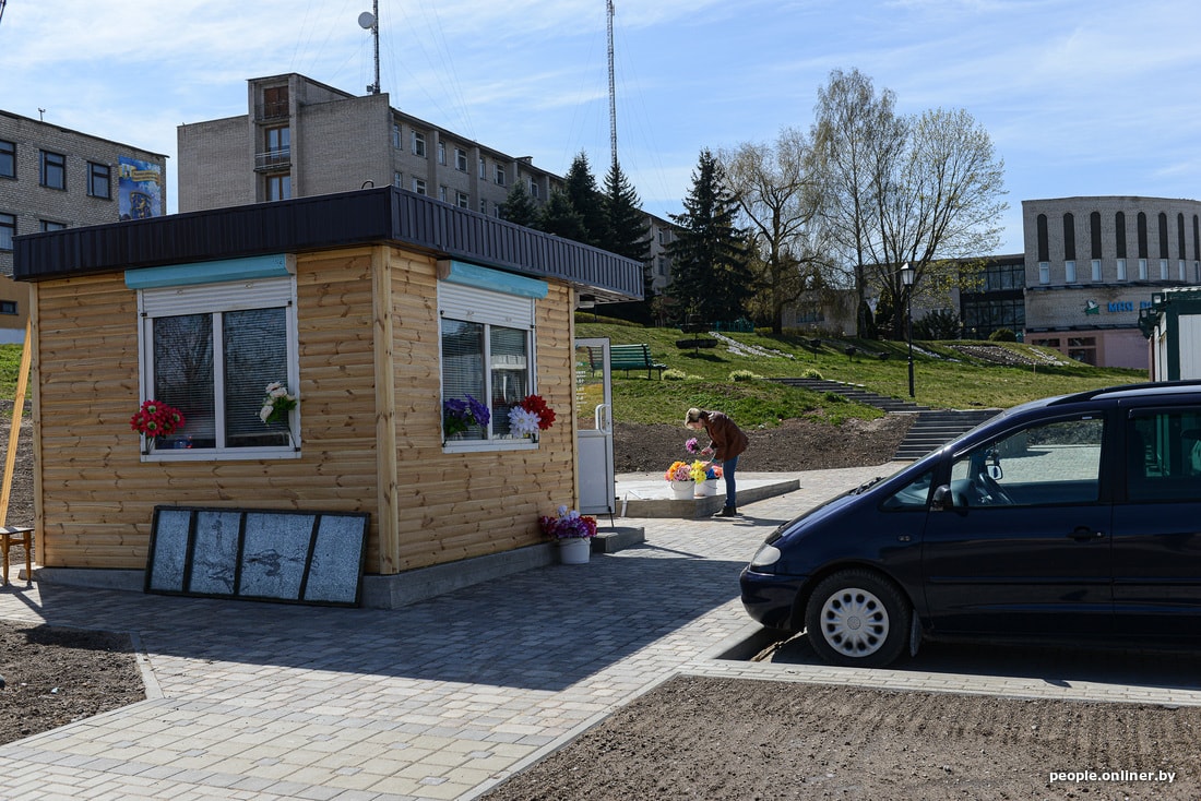Сквозь пыльное полотно виднеется киоск со всякой нужной мелочовкой и искусственными цветами, ведь скоро Радуница. В киоске продавец и один посетитель. Женщина сначала теряется от вопроса, что сейчас происходит в Жировичах. Кстати, все местные называют свою деревню в соответствии с белорусскоязычным оригиналом: Жировицы.