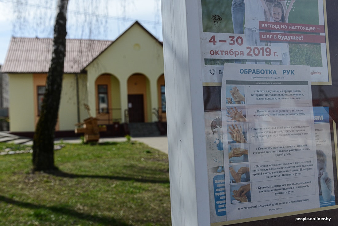 Достоверными сведениями об эпидемической ситуации в агрогородке не владеет ни один житель из тех, с кем нам удалось пообщаться. Идем в местную амбулаторию, чтобы получить хотя бы зерно правды. На входе медсестра исправно замеряет температуру ртутным градусником, потом тщательно опшикивает его антисептиком. Женщина рассказывает, что стационар местечковой больницы скоро перепрофилируют под инфекционку.