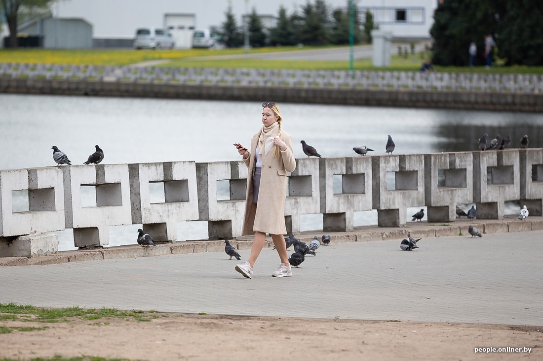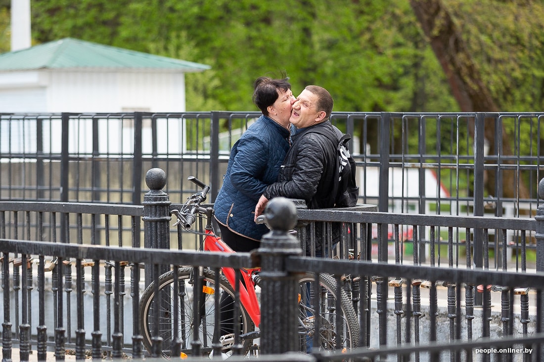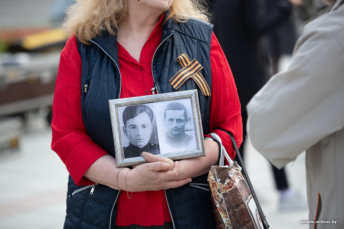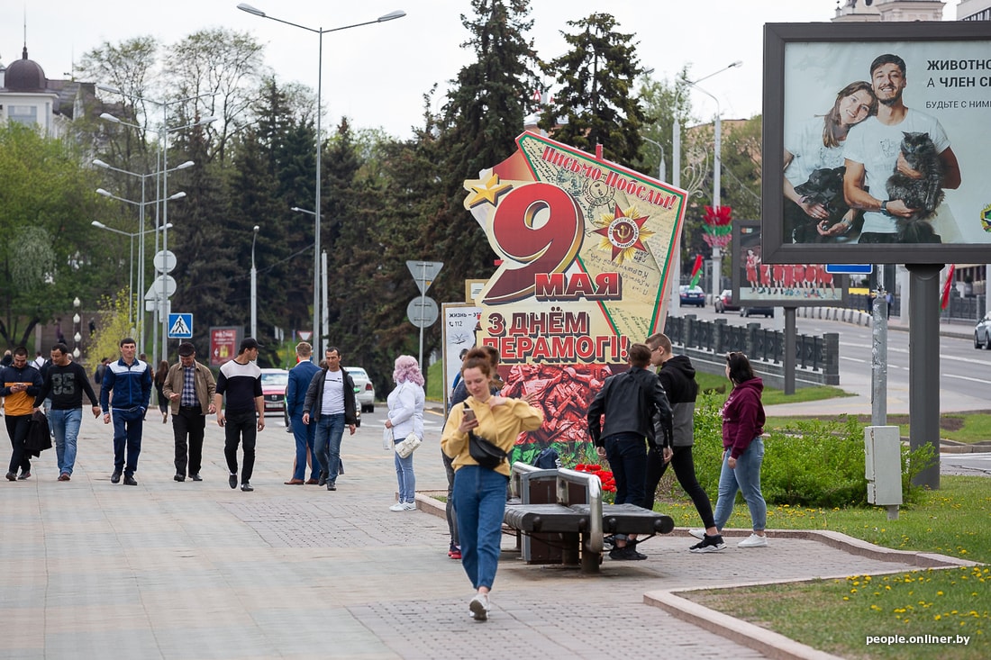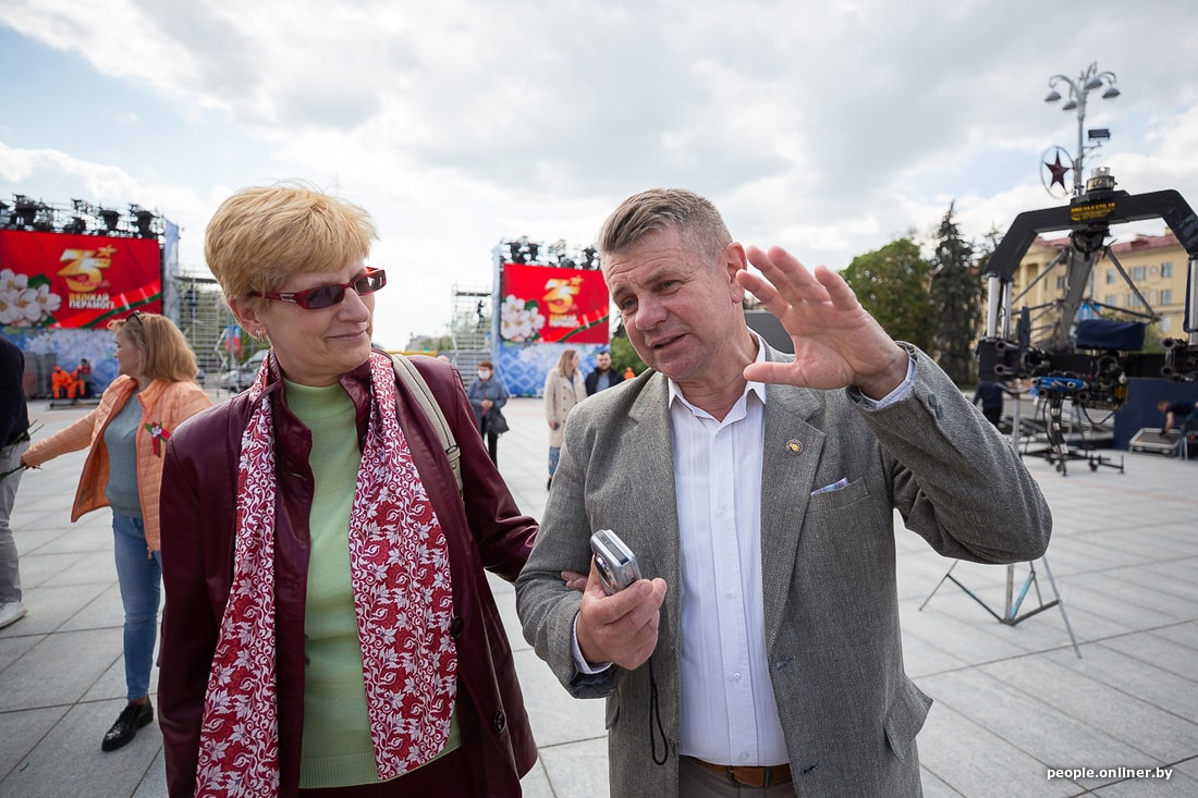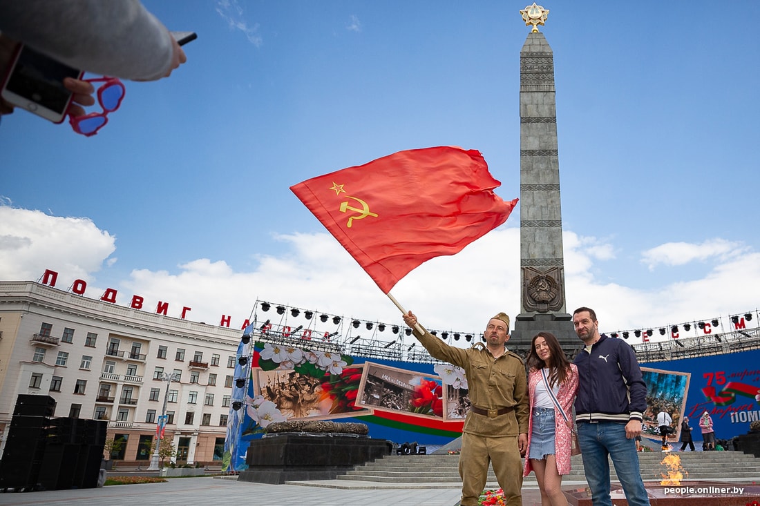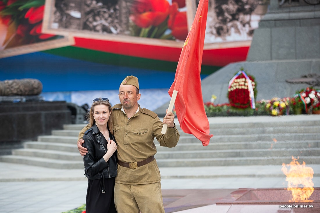 У самого монумента в основном люди постарше или молодые родители со своими детьми. Одни приносят гвоздики, другие селфятся, третьи слоняются без дела. Одна возрастная пара следует к площади Победы от самого центра — от Дворца республики. Муж и жена останавливаются возле знаковых мест, поочередно фотографируют друг друга и выглядят туристами. Но нет, минчане бесконечно благодарят президента, что он все-таки провел парад. Хотя сами они смотрели торжество боевой техники по телевизору.