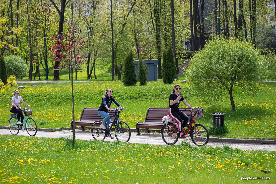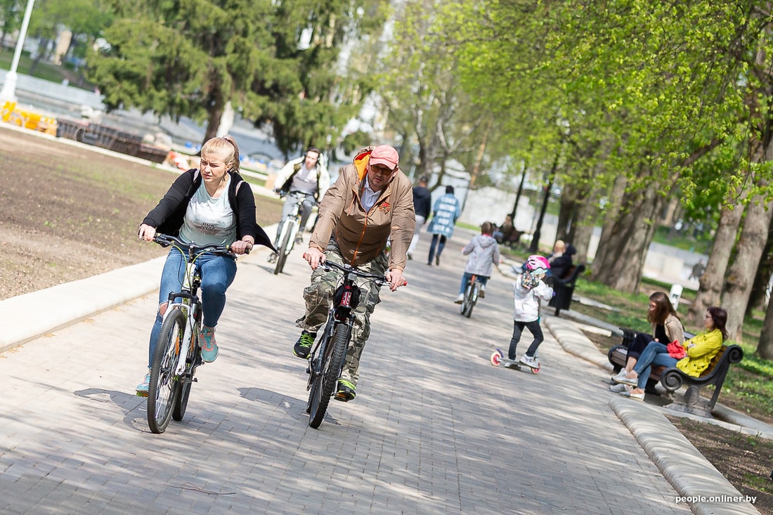 Сейчас кто-то гоняет на самокатах, редкие пары с детьми сидят на лавочках, несколько человек фотографируются у фонтана. Велосипедистов раз-два и обчелся. Вокруг Минск, а народу — словно в райцентре. Да и то в будний день.