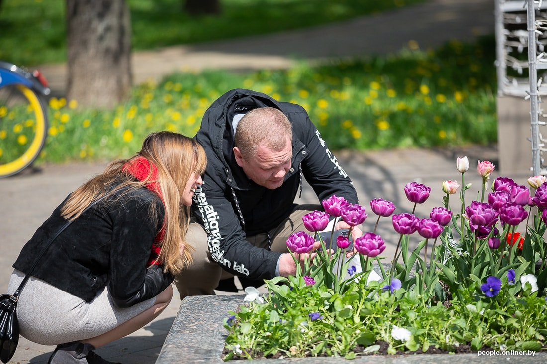 В парке Горького установлена сцена. Два исполнителя с любительской переносной колонкой и два зрителя. Палатки с кофе и поп-корном в большинстве закрыты, но активизировались уличные торговцы — у них можно купить тюльпаны, карамельки, игрушки или даже маски. Каждый крутится как может.