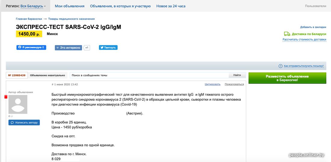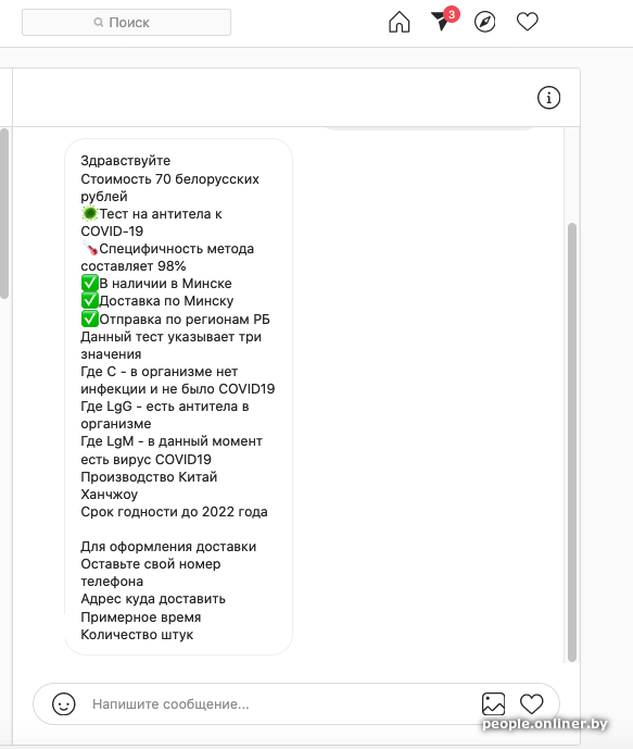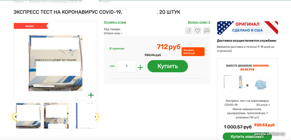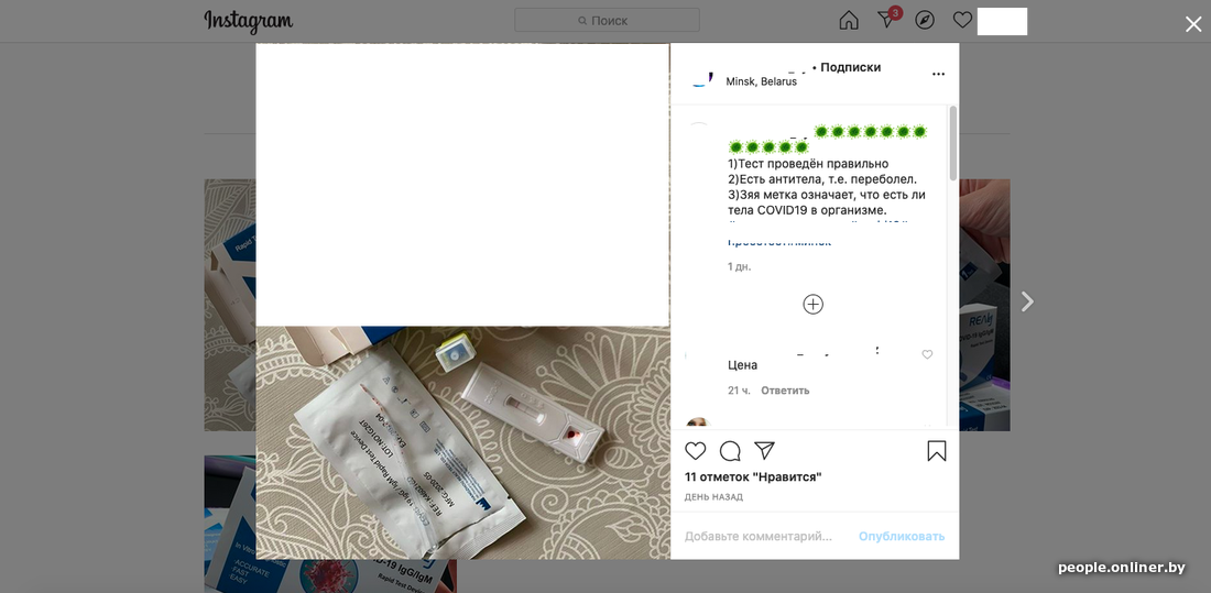 Закон любого бизнеса гласит: если на товар есть спрос, но нет предложения, товар появляется нелегально. Так произошло и с экспресс-тестами на антитела к COVID-19. На различных белорусских сайтах, в соцсетях и на форумах стали появляться объявления о продаже таких систем. Мы встретили тесты китайского, австрийского и американского производства. Заказать первые оказалось проще всего. Их продают поштучно по заявке в Instagram и подвозят к дому — нужны только наличные. С австрийскими сложнее: пока продаются только оптом — почти 1500 рублей за коробку с 25 тестами. Американские требуют долгой доставки и выдержки (от 9 до 18 дней) и отпускаются тоже упаковкой — правда, по 700 рублей за 20 тестов.