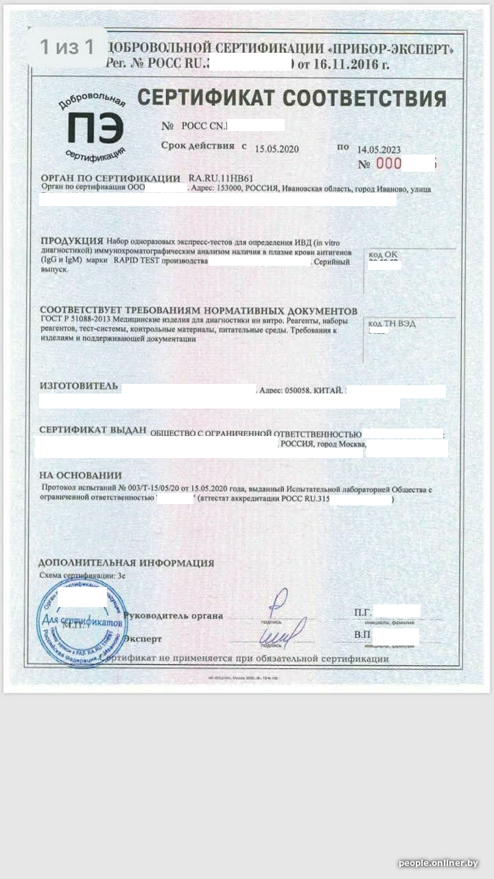 На вопрос, такие ли это тесты, как у Минздрава, владелец аккаунта прислал сертификат соответствия от российской компании из славного города Иваново. Организация занимается сертификатами для пищевых продуктов. Мы спросили у россиян, действительно ли они выдавали сертификат на медицинское изделие, — ответа пока не получили.