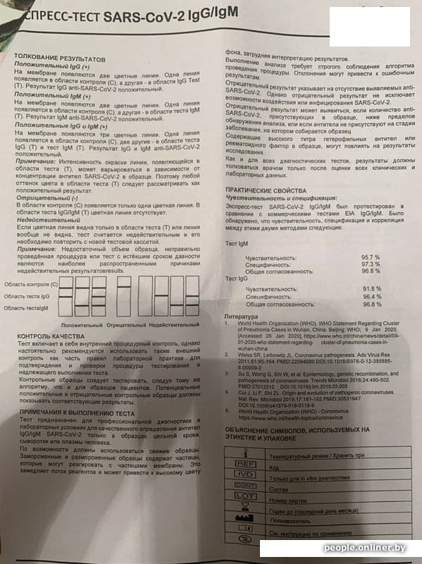 Но в белорусском Instagram-аккаунте говорят, что в России эти тесты используют повсеместно. Что странно, в реестре Росздравнадзора нет зарегистрированных тестов данного производителя. Нет их и в собранном французским министерством здравоохранения перечне, куда входит 102 наименования известных ныне экспресс-тестов на антитела к COVID-19.