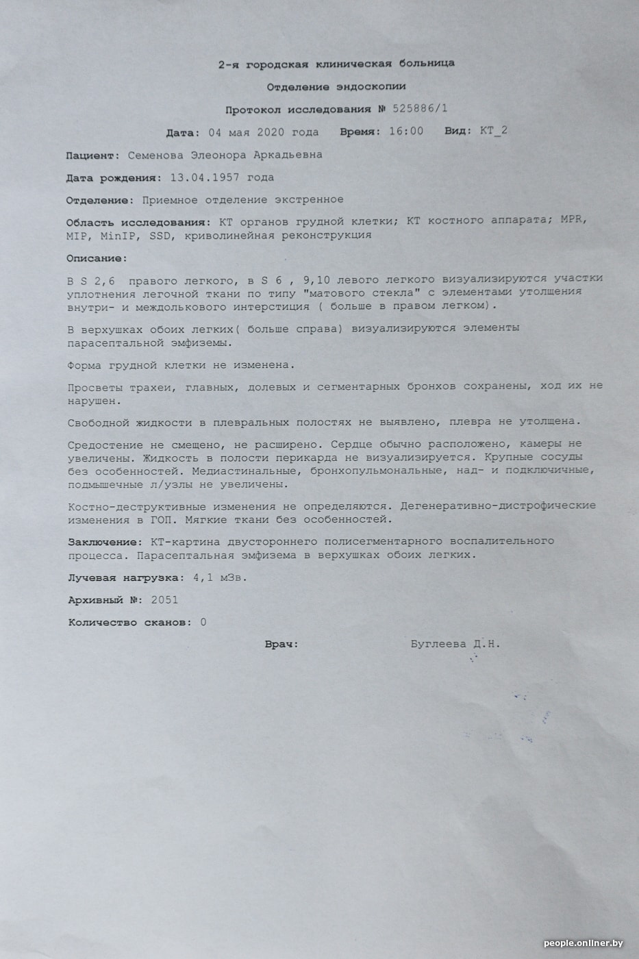 — Пришел уже другой доктор. Он послушал и безоговорочно сказал: «В больницу». Нас привезли в 2-ю больницу. Взяли мазки и сделали экспресс-тесты. У меня были незначительно положительные иммуноглобулины M. У мужа тест оказался отрицательным. Поэтому меня направили на КТ, а его — на рентген с диагнозом «бронхит». В итоге мне сказали готовиться к госпитализации, а мужу — лечиться дома.