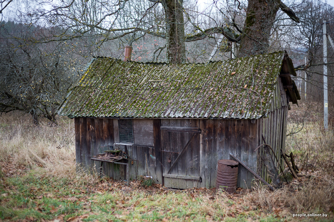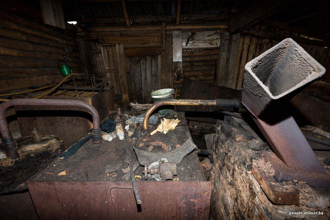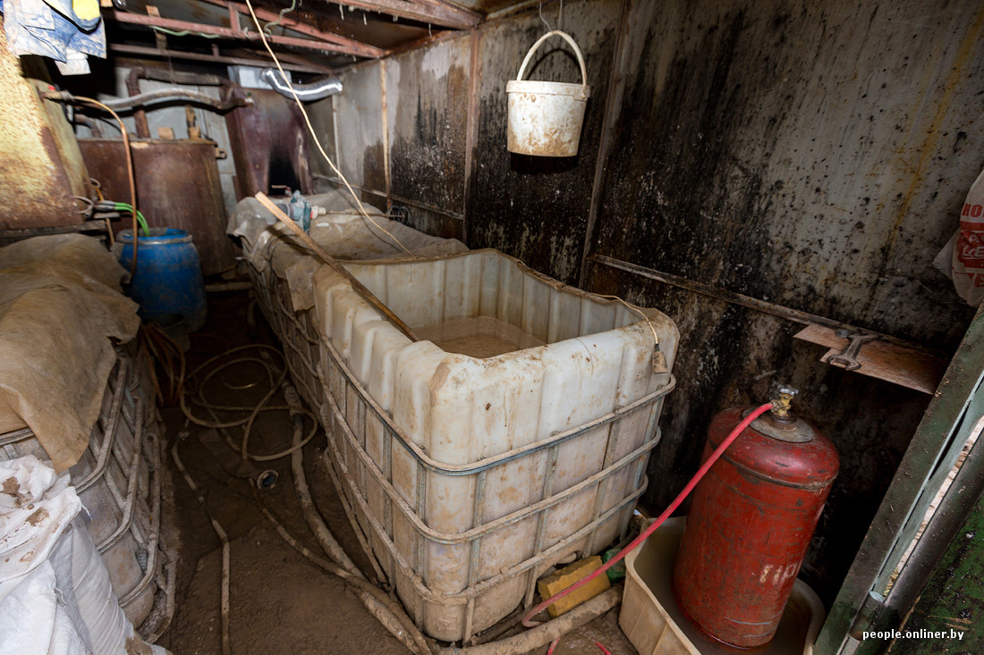 Ничем не примечательный на первый взгляд сарай содержит в своем почерневшем от времени и недавних производственных процессов брюхе сложную конструкцию в виде самогонного аппарата внушительных размеров. Разглядеть его можно через пустую глазницу окна, заколоченного куском жестянки. Снизу выглядывают серые трубки, по которым во время варки отходы выливаются в и так не слишком приветливую окружающую действительность.