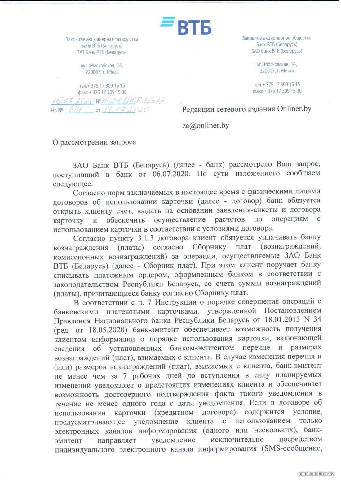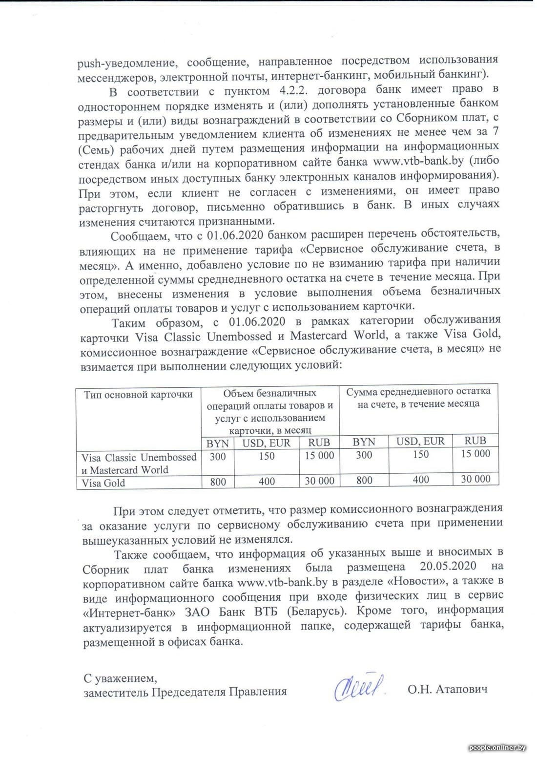 — При этом следует отметить, что размер комиссионного вознаграждения за оказание услуги по сервисному обслуживанию счета при применении вышеуказанных условий не изменялся, — отмечают в письме. — Информация об указанных выше и вносимых в Сборник плат банка изменениях была размещена 20.05.2020 на корпоративном сайте банка в разделе «Новости», а также в виде информационного сообщения при входе физических лиц в сервис «Интернет-банк» ЗАО «Банк ВТБ (Беларусь)». Кроме того, информация актуализируется в информационной папке, содержащей тарифы банка, размещенной в офисах банка.