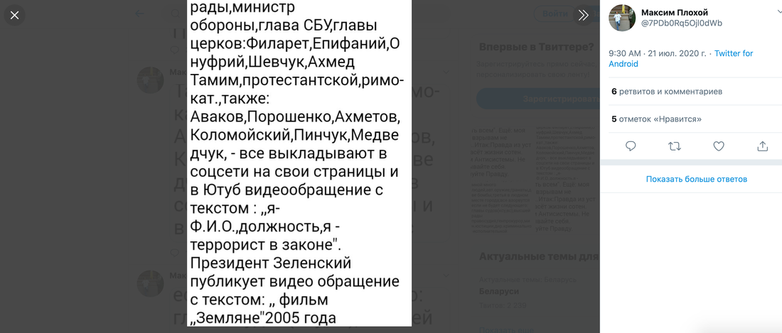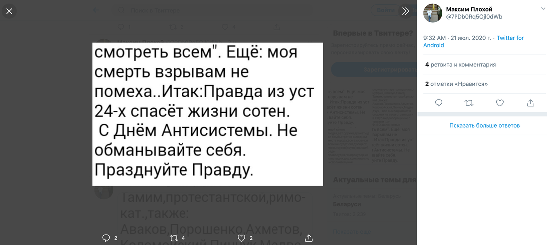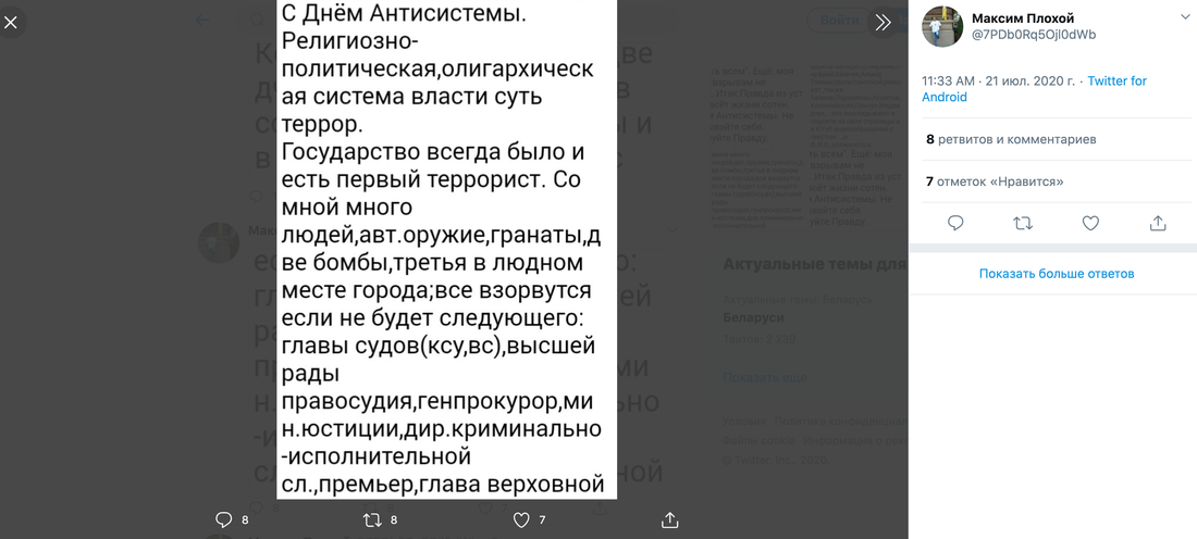 В Twitter он поздравил всех с «днем антисистемы», заявив, что «государство — это первый террорист». Он требует, чтобы главы судов, министерств, прокуратуры, церкви записали и выложили на YouTube заявления о том, что они сами — террористы в законе. А президент Владимир Зеленский по его требованию должен сказать: «Фильм „Земляне“ 2005 года смотреть всем». «Земляне» — это документальный фильм о проблеме эксплуатации животных людьми.
