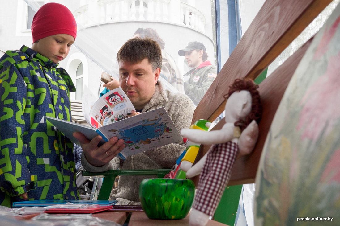 Во дворе — атмосфера детского праздника. Музыка, конкурсы, аниматоры и веселые игры, немного еды. Каждый может сфотографироваться в фотозоне и купить красивый сувенир на память. Люди приходили и уходили, в разгар ярмарки одновременно во дворике находилось около 60—70 человек.