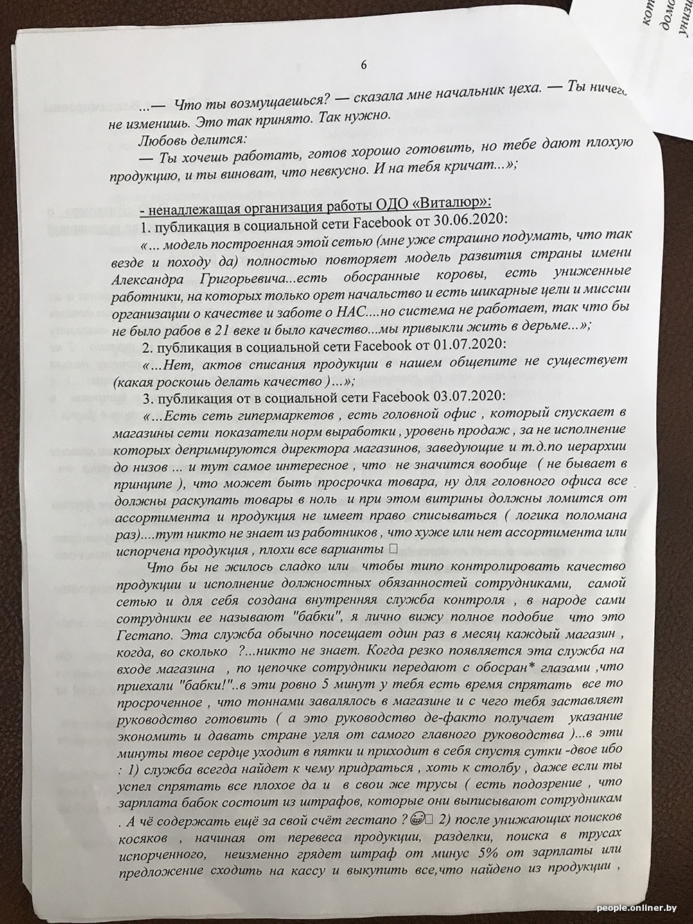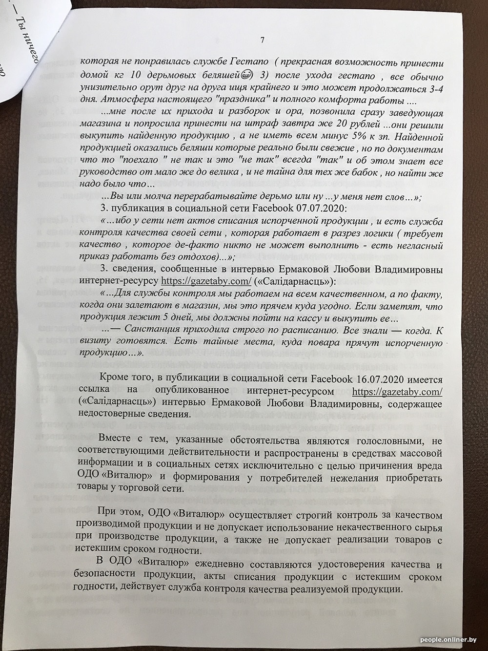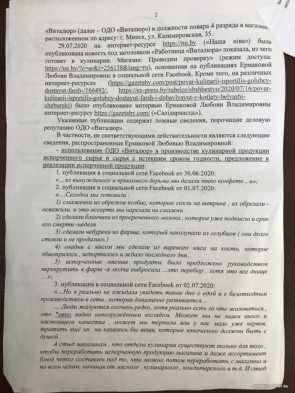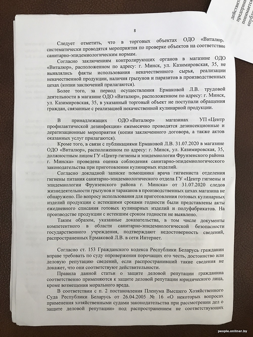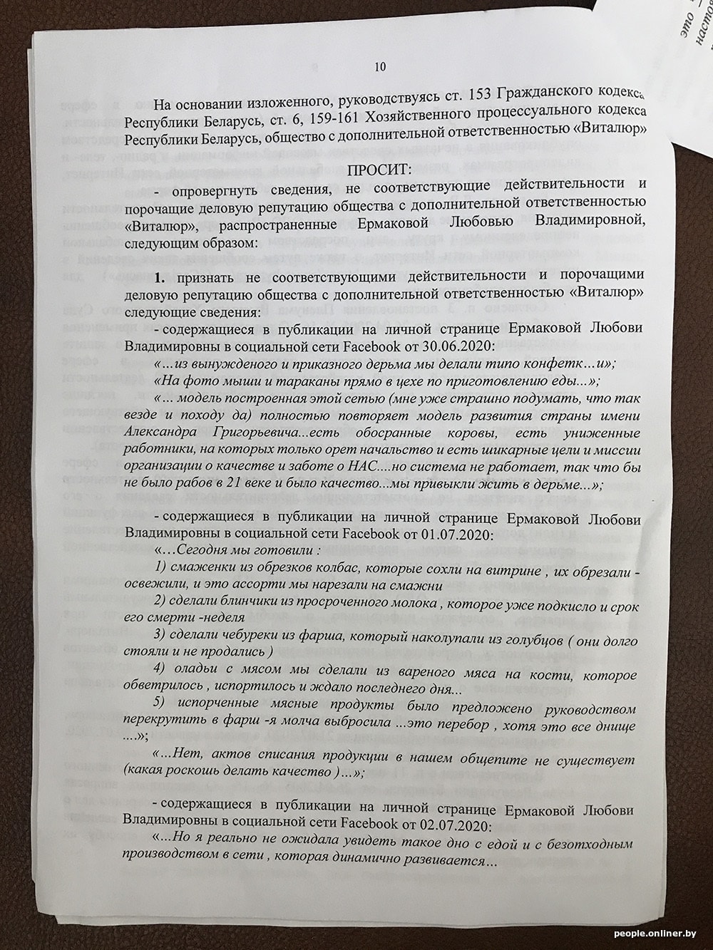 В исковом заявлении «Виталюр» приводит примеры недостоверной информации и настаивает на своей правоте: «Вместе с тем указанные обстоятельства являются голословными, не соответствующими действительности и распространены в средствах массовой информации и в социальных сетях исключительно с целью причинения вреда ОДО „Виталюр“ и формирования у потребителя нежелания приобретать товары торговой сети. < …> При этом ОДО „Виталюр“ осуществляет строгий контроль за качеством производимой продукции и не допускает использования некачественного сырья при производстве продукции, а также не допускает реализации товаров с истекшим сроком годности…»
