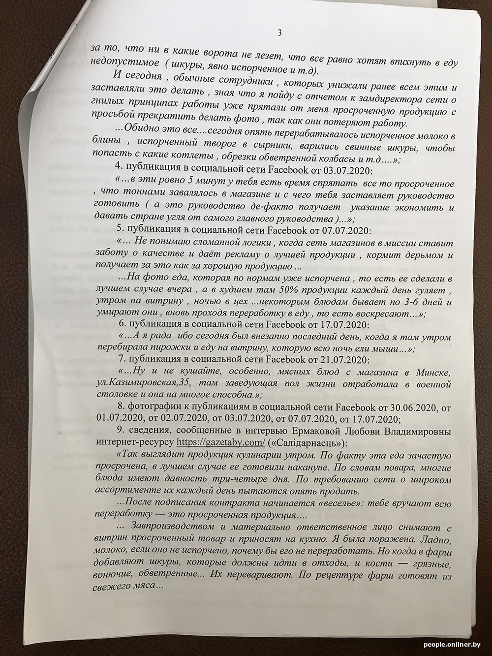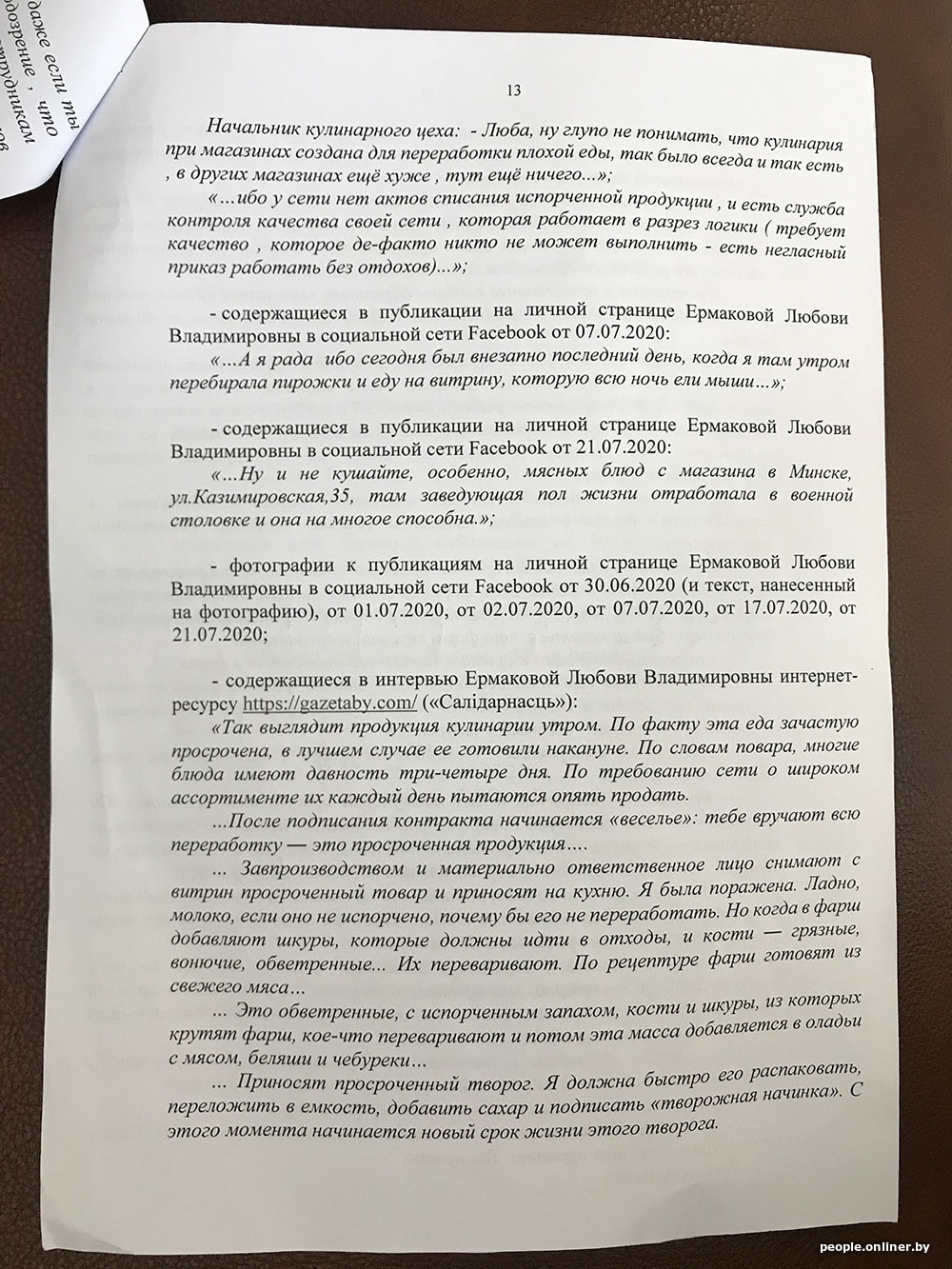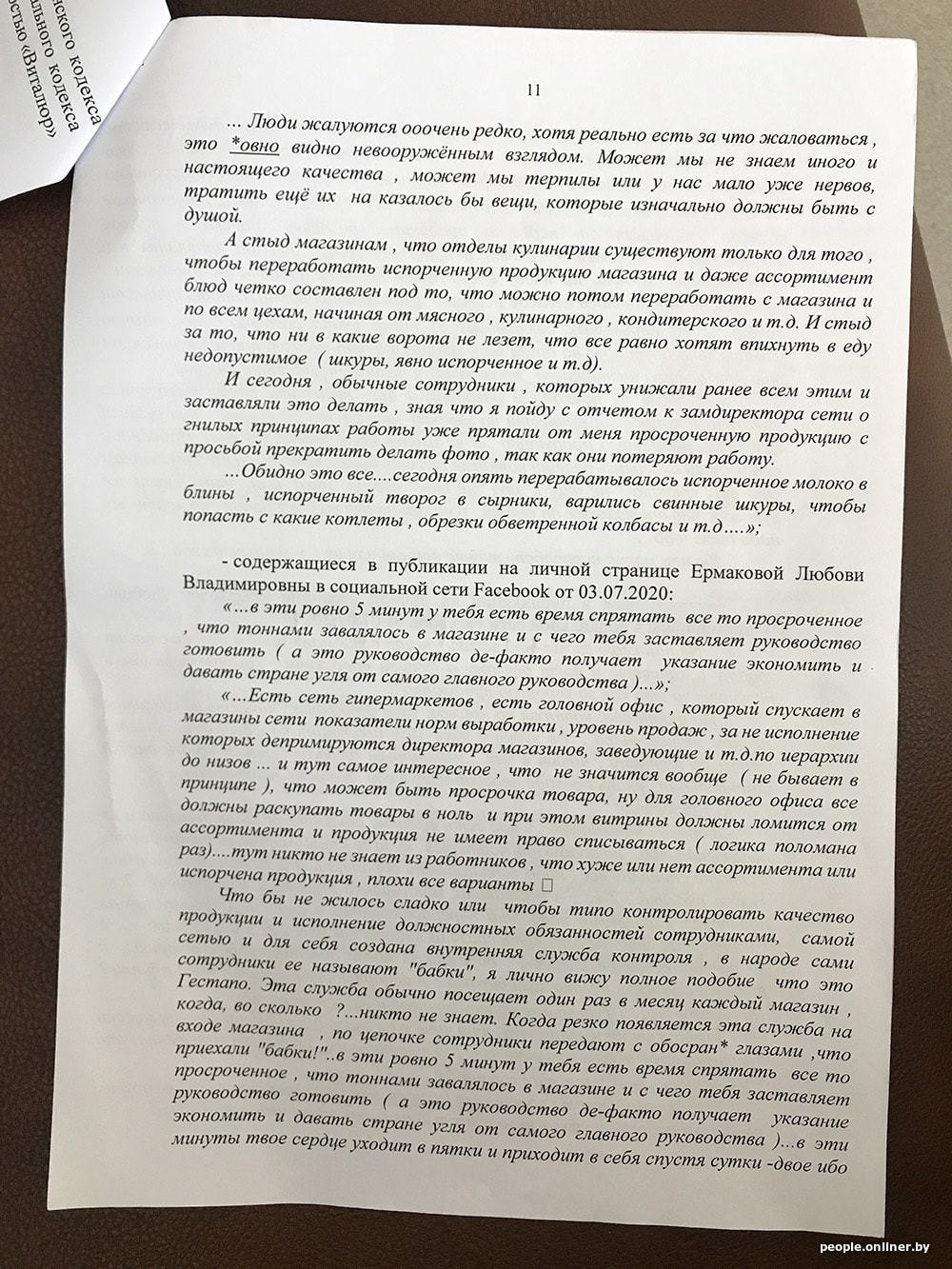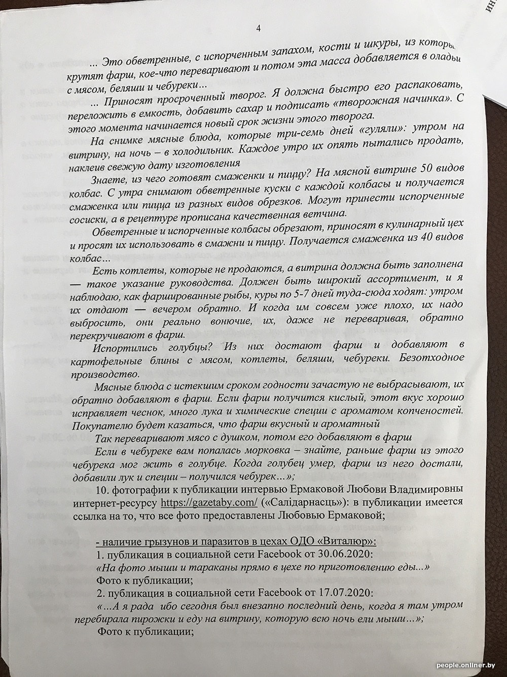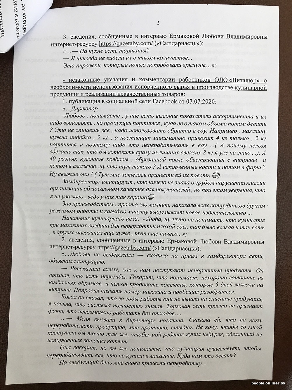 В исковом заявлении «Виталюр» приводит примеры недостоверной информации и настаивает на своей правоте: «Вместе с тем указанные обстоятельства являются голословными, не соответствующими действительности и распространены в средствах массовой информации и в социальных сетях исключительно с целью причинения вреда ОДО „Виталюр“ и формирования у потребителя нежелания приобретать товары торговой сети. < …> При этом ОДО „Виталюр“ осуществляет строгий контроль за качеством производимой продукции и не допускает использования некачественного сырья при производстве продукции, а также не допускает реализации товаров с истекшим сроком годности…»