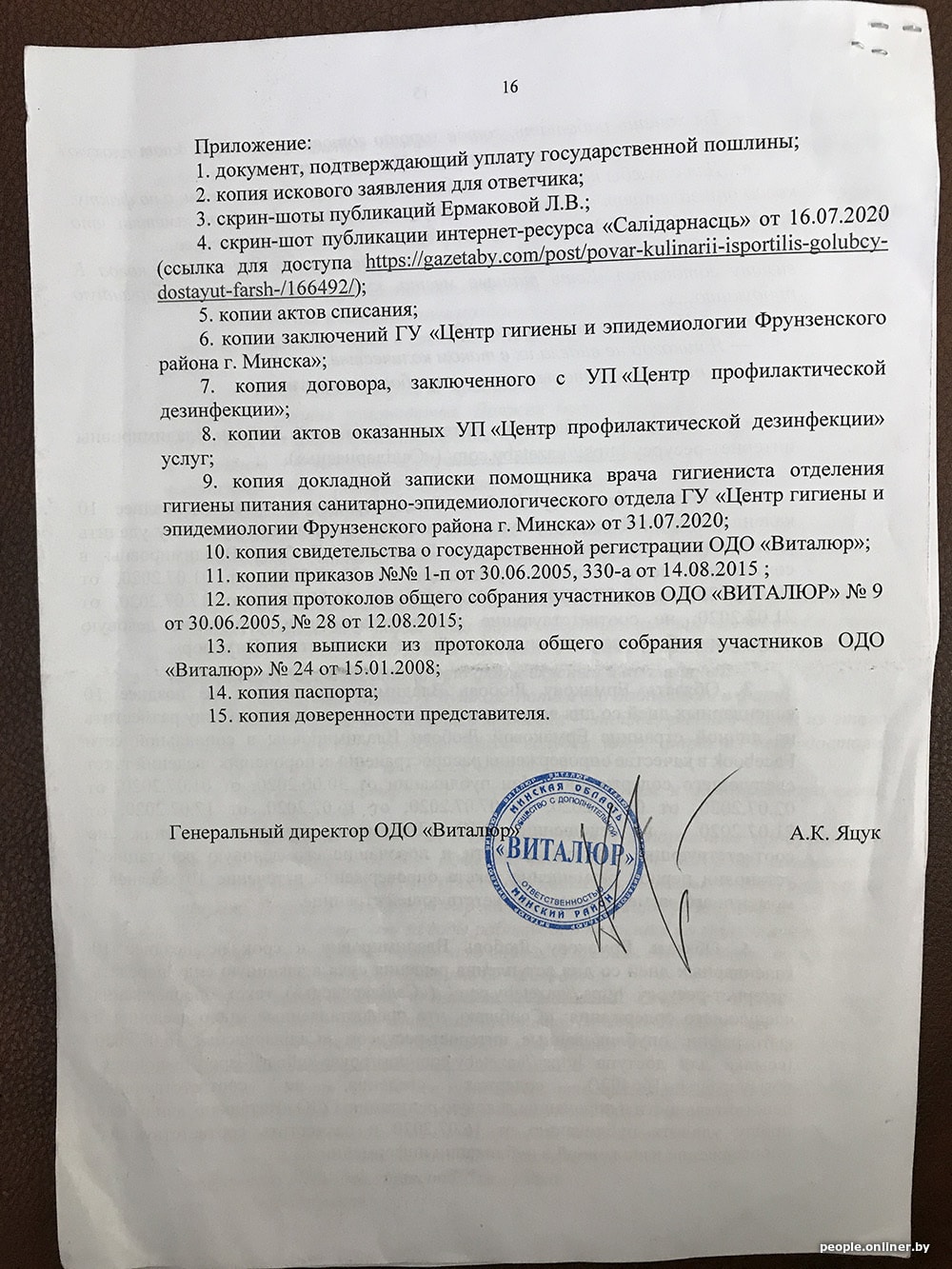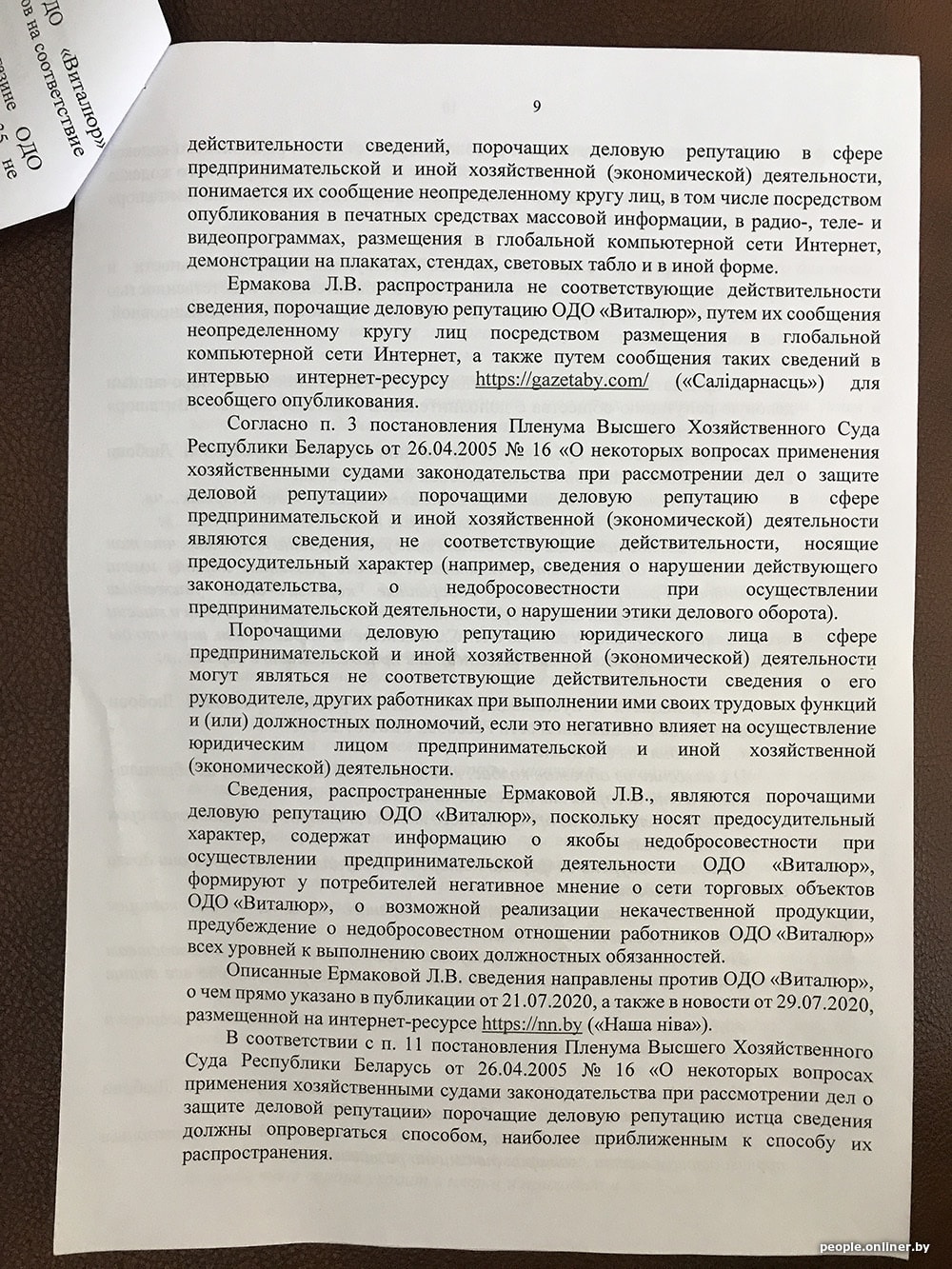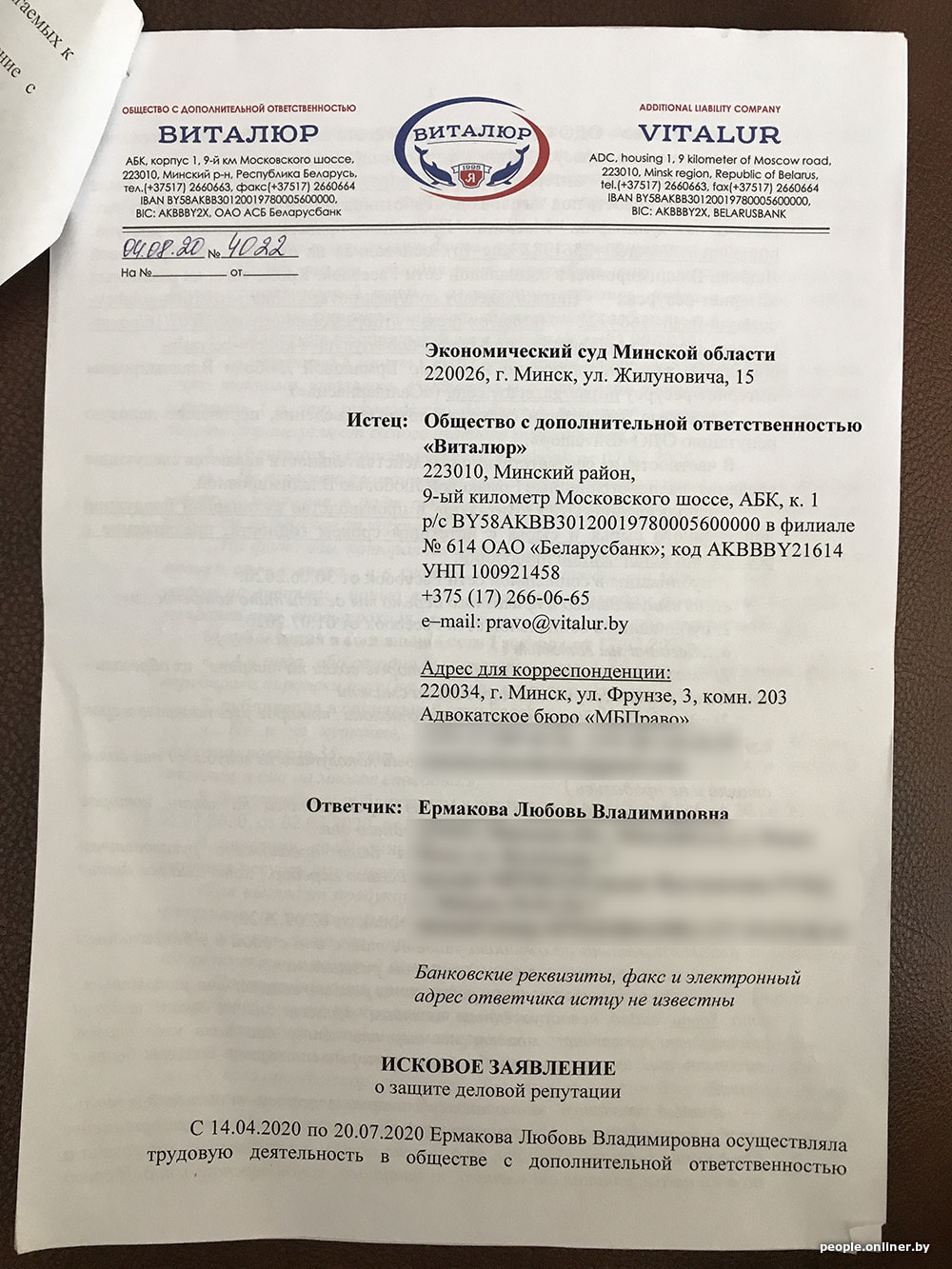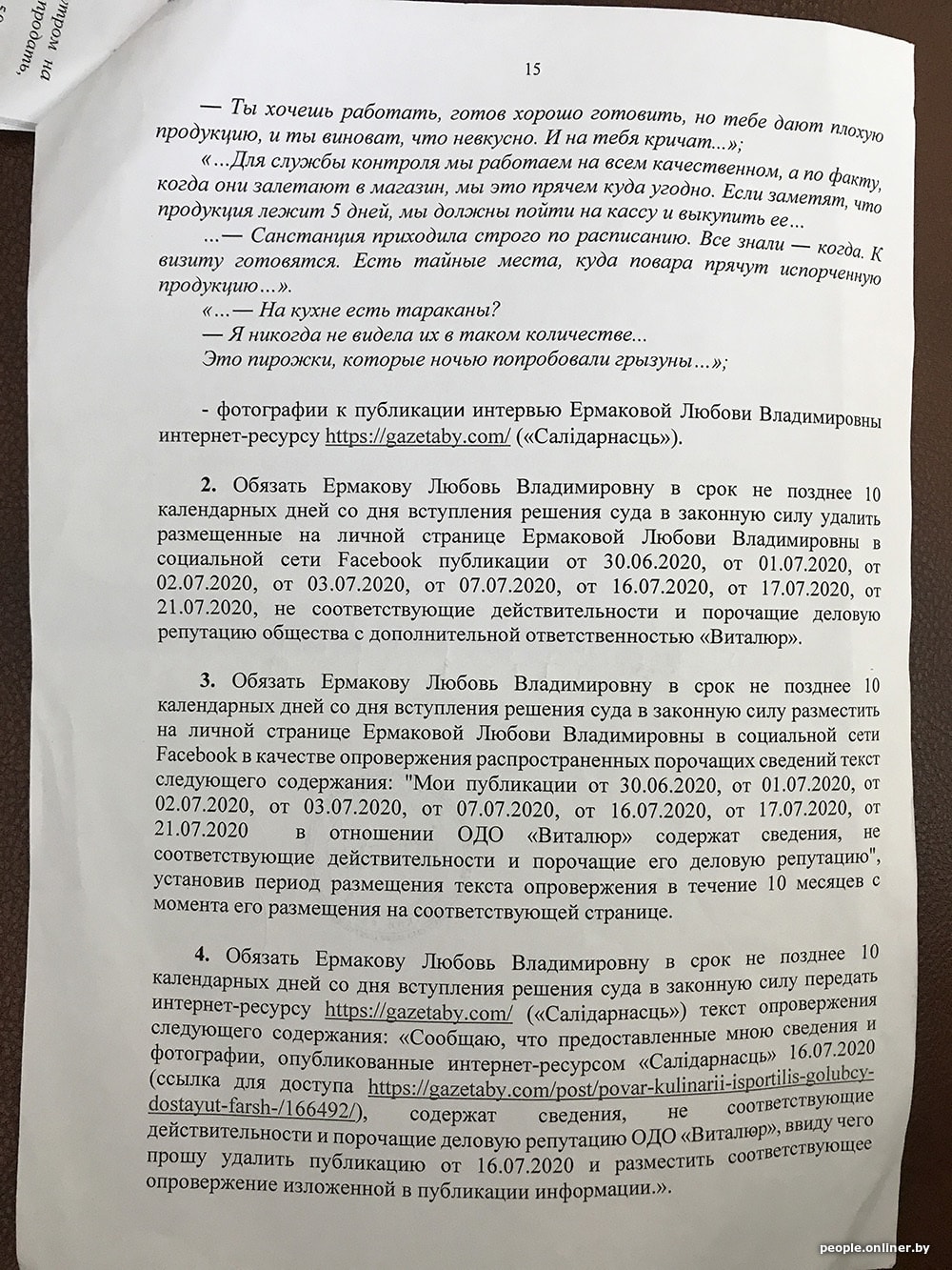 — Исковые требования «Виталюра» удовлетворить. Признать не соответствующими действительности и порочащими деловую репутацию сведения, содержащиеся в публикациях на Facebook и в статье на сайте nn.by. Обязать Любовь Ермакову в срок не позднее 10 календарных дней после вступления решения в силу удалить публикации и вместо них разместить текст следующего содержания: «В моих публикациях… в отношении ОДО „Виталюр“ содержатся сведения, не соответствующие действительности и порочащие их деловую репутацию».