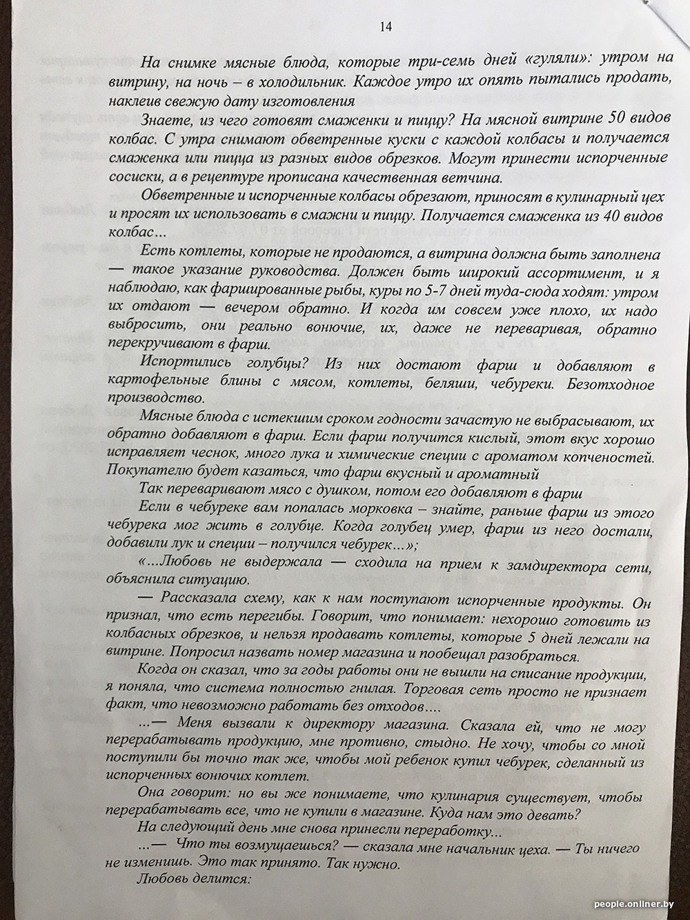 — Я была в тяжелом состоянии. Люди ненавидят свою работу. Но я вынуждена была ради содержания детей мириться с условиями. Это была душевная боль. Я не указывала название. Но было обидно. Хотела сказать: если видите испорченную продукцию, дайте магазину понять, что вы в курсе. Иначе в торговле не перестанут обманывать. Это рабство XXI века. Вместо поощрений — штрафы, штрафы, штрафы. Мне сейчас стыдно, что я в этом принимала участие. Получается, что под давлением я была вынуждена нарушать свои должностные обязанности.
