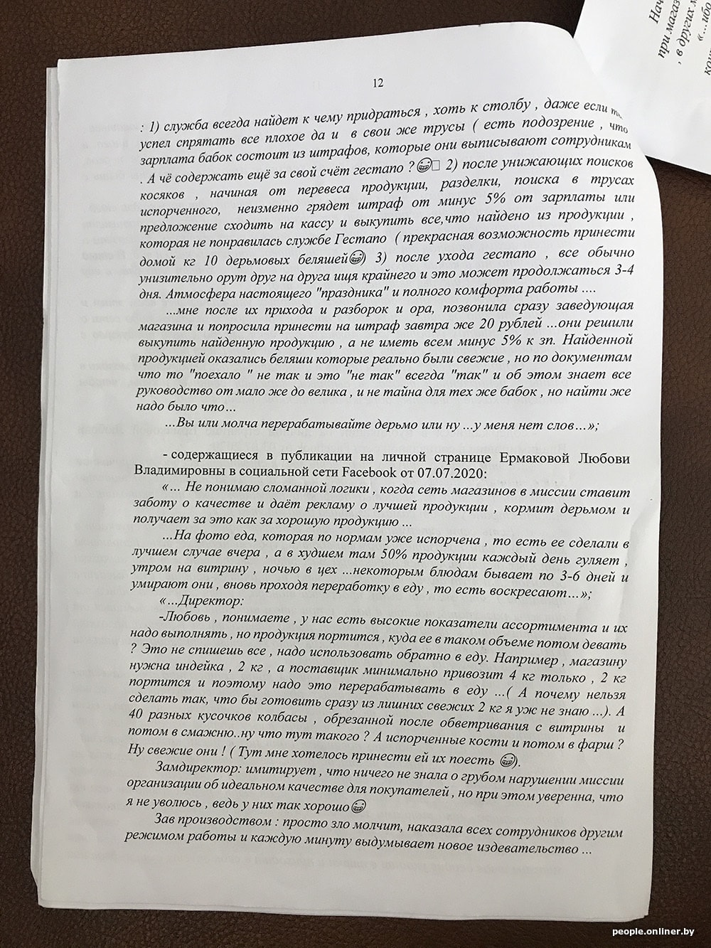 После этого, пишет Ермакова, «неизменно грядет штраф от минус 5% от зарплаты или предложение сходить на кассу и выкупить все, что найдено из продукции, которая не понравилась службе гестапо (прекрасная возможность принести домой кг 10 дерьмовых беляшей)».