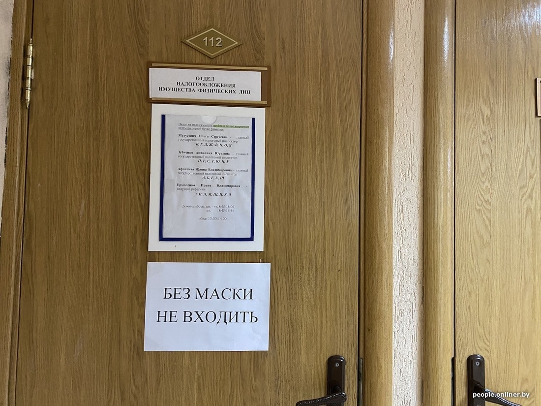 Я никогда не бывала в таких учреждениях, но как раз недавно родственники обсуждали, что хотят отказаться от участка земли, за который нужно платить налог. Пользуясь случаем, захожу, чтобы «просто спросить». На входе в здание посетителей встречают сотрудник налоговой и милиционер, у местного ресепшена стоит пара горожан — все в масках.