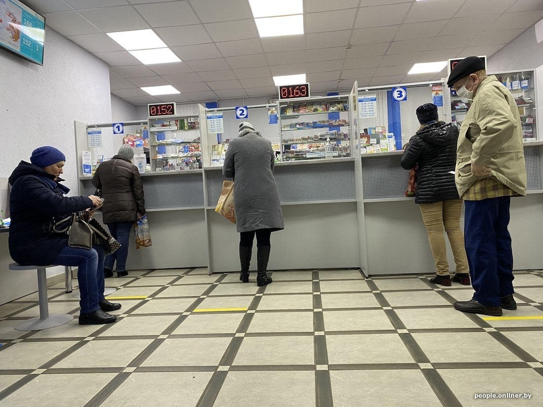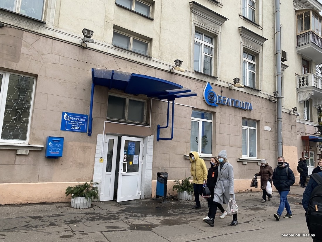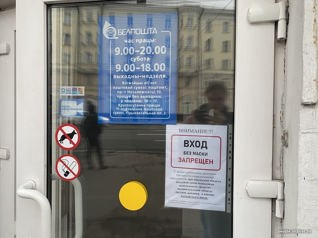 Почему-то в отделениях «Белпочты» одни из самых суровых предупреждающих надписей. Кажется, если зайдешь за конвертом без маски, немедленно расстреляют. Осторожно дернув дверную ручку, просачиваюсь в здание. Беру талон и жду то ли своей очереди, то ли трибунала. Оптимизм вселяет еще одна посетительница, которая пришла без маски. Уже не так страшно. Спустя пару минут ожидания — ни угроз, ни криков, ни презрения. Успокоилась и мирно дождалась своей очереди.