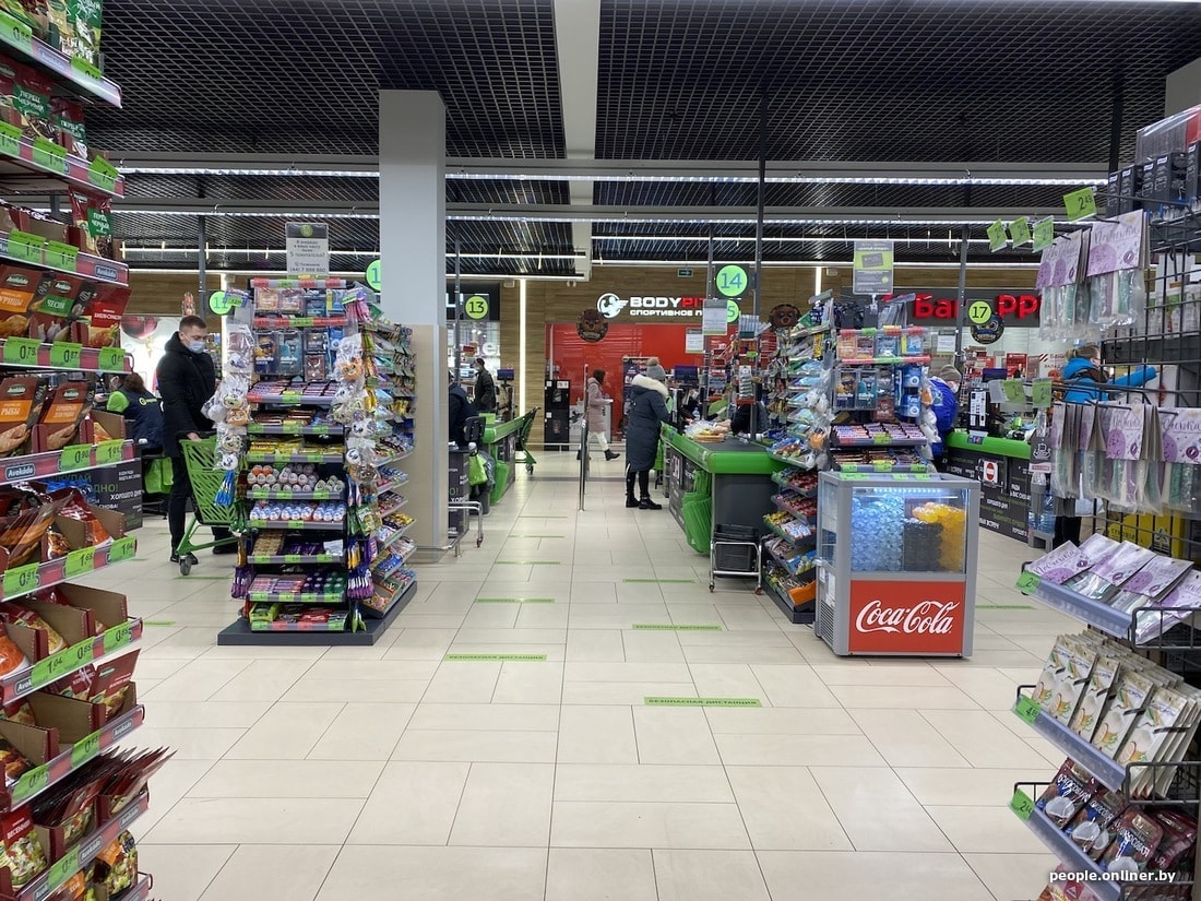 Мой экспериментальный маршрут начинается с продуктового магазина шаговой доступности. Недалеко от дома, мало посетителей — идеально для начала маршрута, да и не так стыдно. Тем более что на дверях торговой точки нет упоминания о масках, просто висит рекомендация держать дистанцию в полтора метра и пользоваться антисептиком (он стоит на входе в магазин).