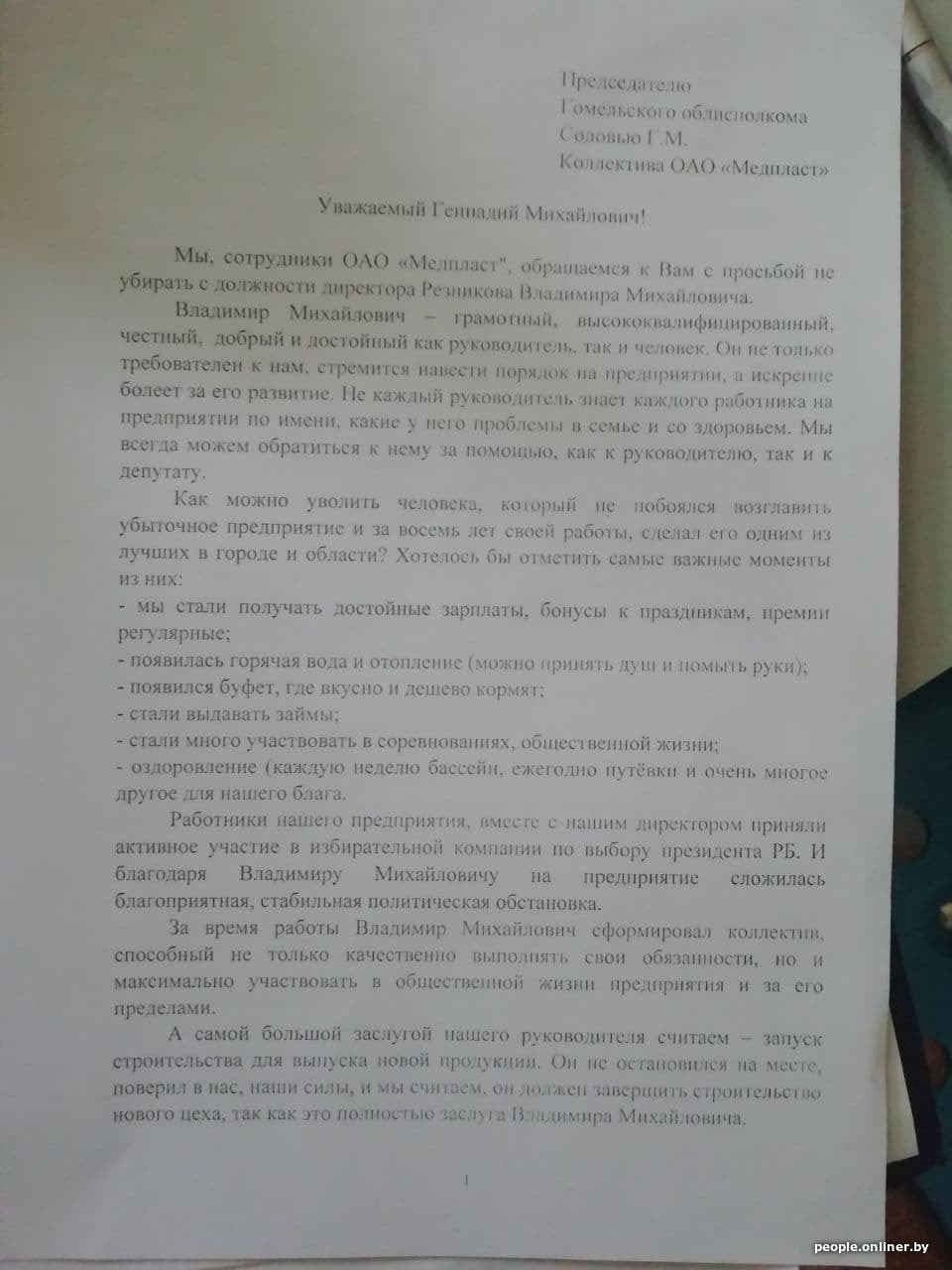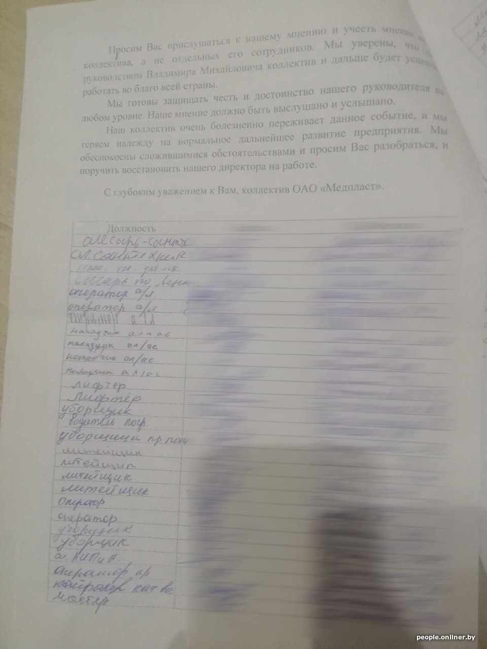 Недавно работники «Медпласта» написали председателю облисполкома: просим не убирать директора, он грамотный и достойный человек. То есть прознали, что собираются уволить. Как они заранее догадались о намерениях собственника, каким образом это прошение возникло и что там вообще за процессы в коллективе — теперь разное рассказывают, но доказать невозможно. Факт в том, что письмо подписала значительная часть персонала — 137 человек (всего в штате 220):